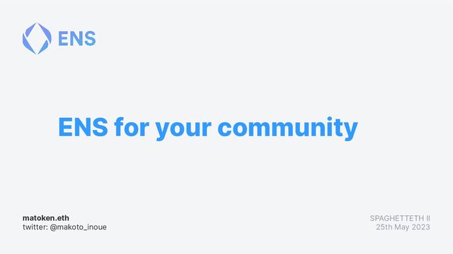 ENS for your community matoken.eth twitter: @makoto_inoue SPAGHETTETH II 25th