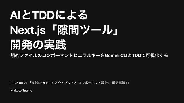 のネストや error.tsx の適用範囲などを可視化 し、問題の原因を素早く特定 ドキュメントの自動生成 プロジェクトのルーティング構成をドキュメントに反映 静的解析の拡張 「このセグメントには loading.tsx が必須」といった独自 ルールを自動チェック { "name": "app", "path": "app", "type": "app-directory", "children": [ { "name": "layout.tsx", // ファイル名、またはフォルダ名 "path": "app/layout.tsx", // appディレクトリからの相対パス "type": "layout", // 規約の種類 "children": [ // 再帰的な階層構造 { "name": "template.tsx", "path": "app/template.tsx", "type": "template", "children": [ { "name": "loading.tsx", "path": "app/loading.tsx", "type": "loading", "children": [ { "name": "page.tsx", "path": "app/page.tsx", "type": "page",