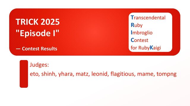 – 2nd: TRICK 2015 – 3rd: TRICK 2018 FINAL – 4th: TRICK 2022 Returns – 5th: TRICK 2025 "Episode I" • This presentation announces the winners of TRICK 2025