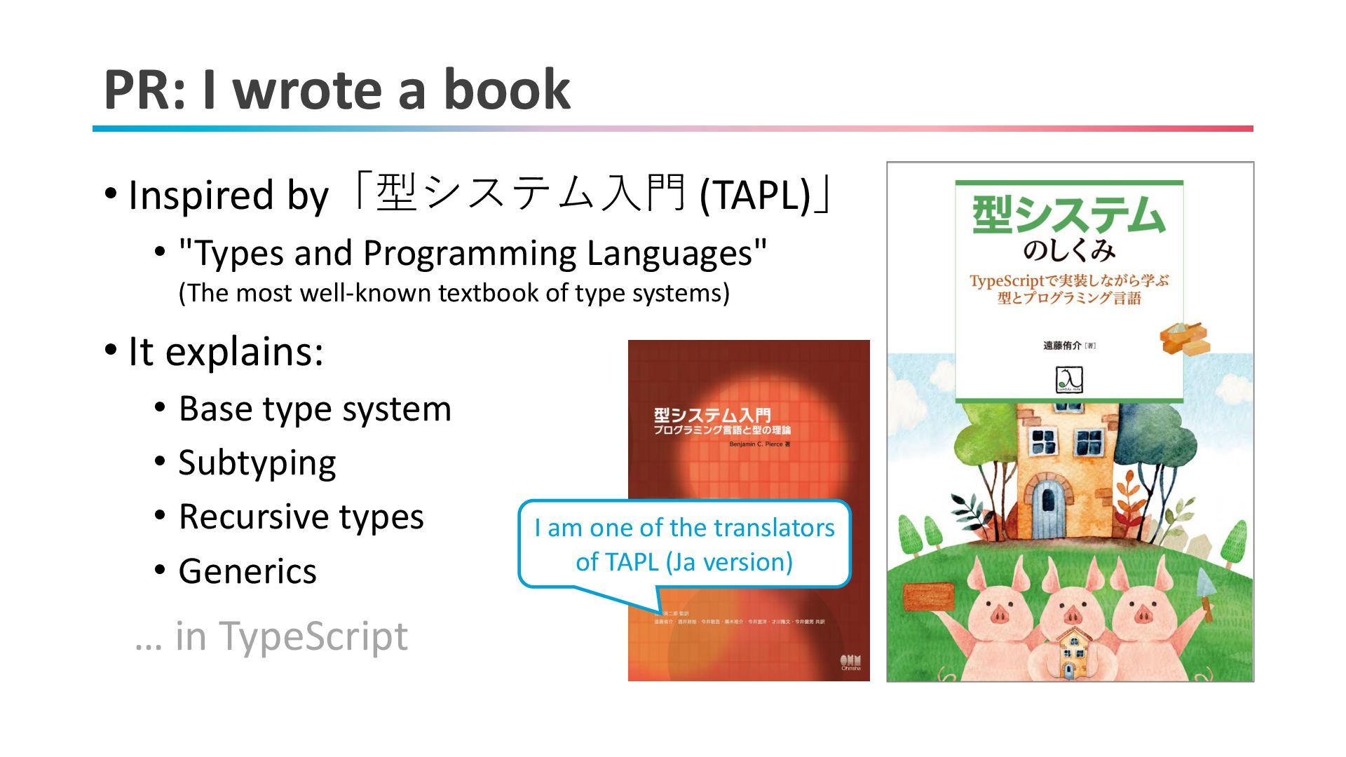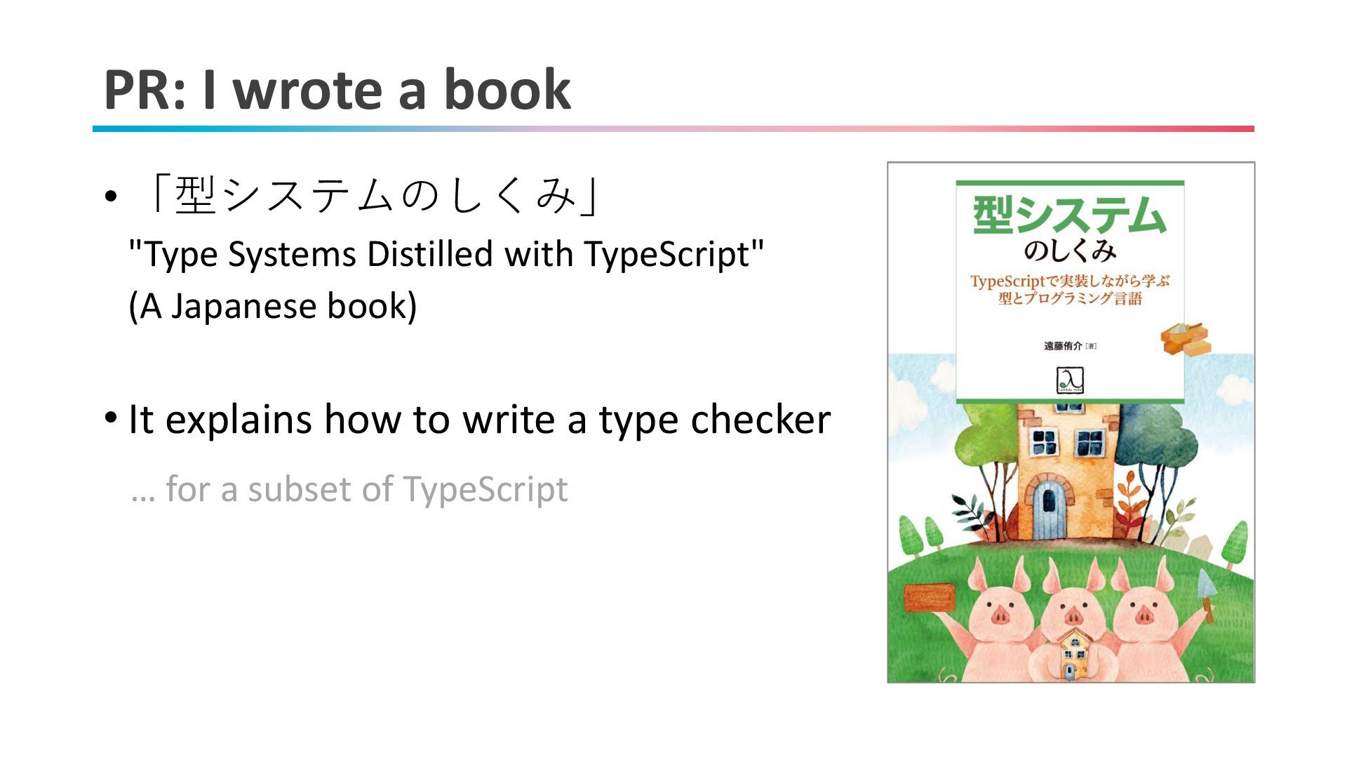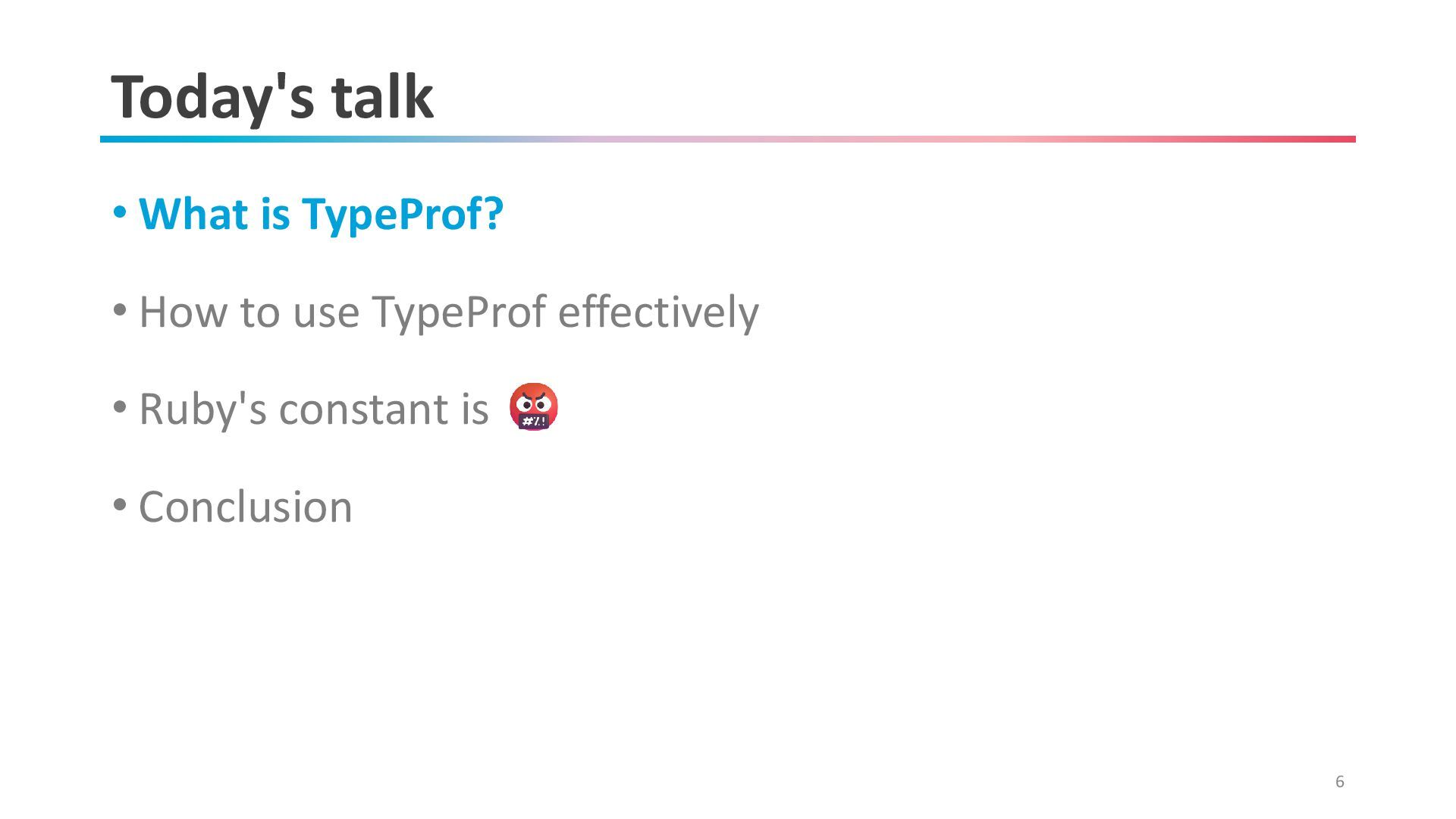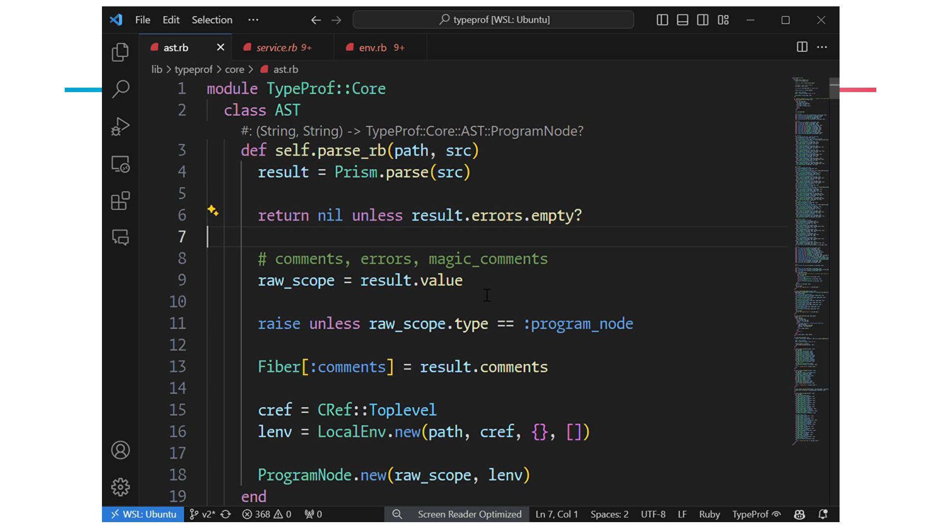 "Ruby TypeProf" plugin • Put typeprof.conf.json (or jsonc) in the top folder • Reopen VSCode, and see if it works • If it doesn't work well, that's a good chance to contribute • For details, check my slide deck for RubyKaigi 2024 { "typeprof_version": "experimental", "rbs_dir": "sig/", }