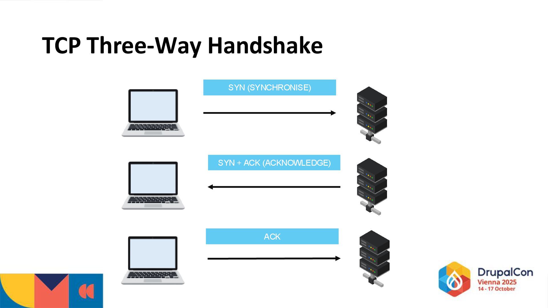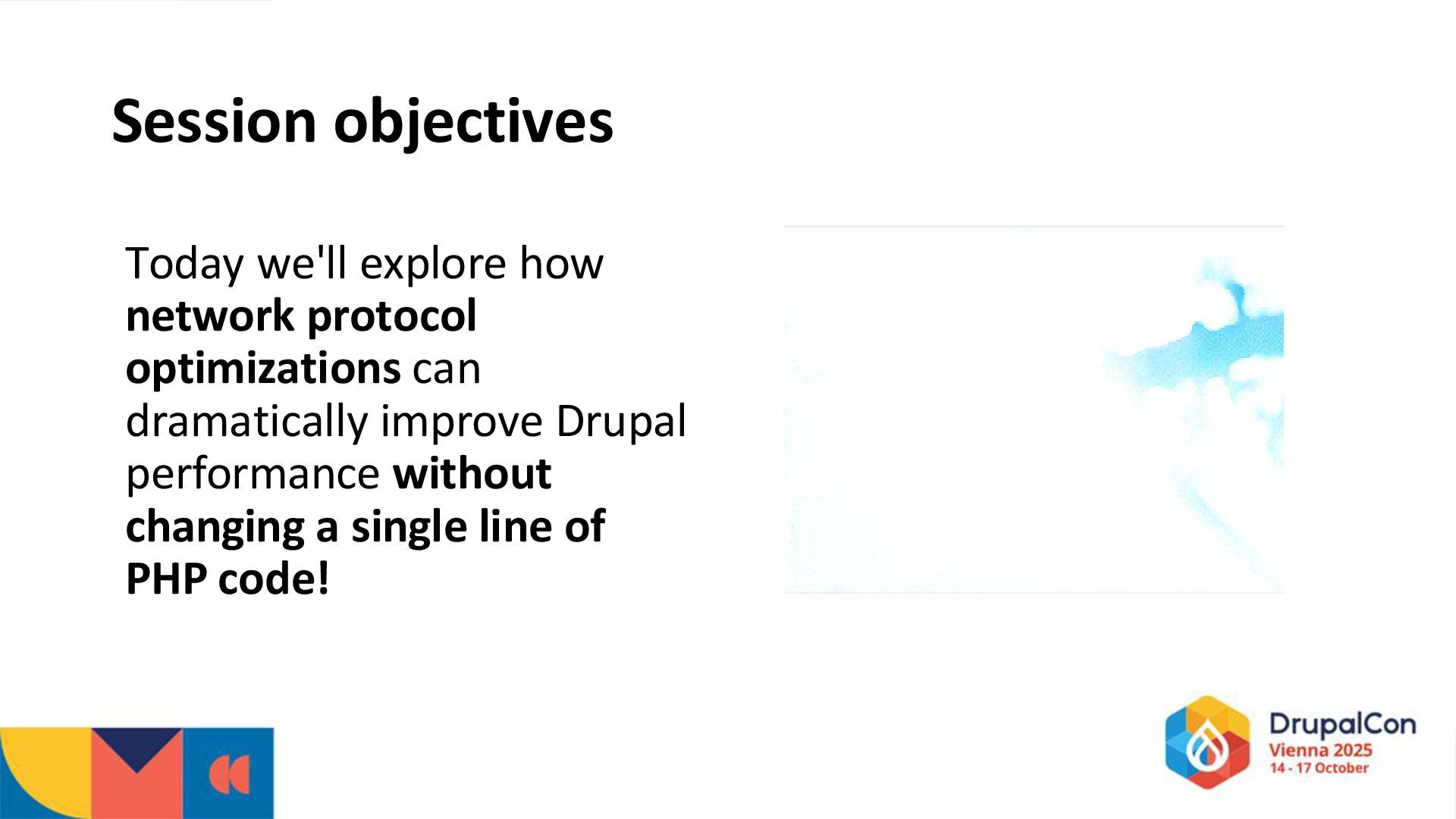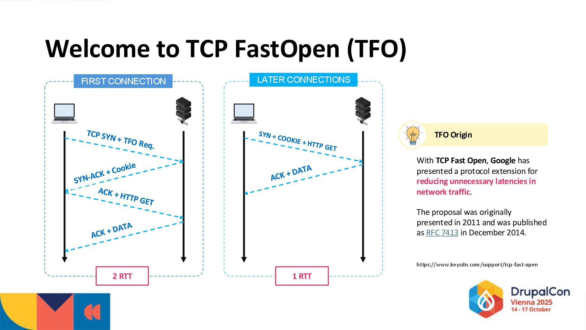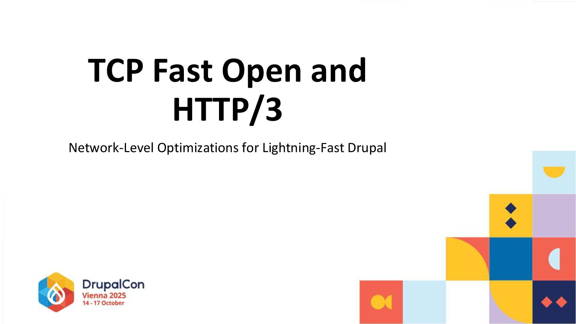 "Hello everyone! Thank you for coming. Today, we'll talk about network optimizations for Drupal. TCP Fast Open and HTTP/3. Let's make Drupal faster!"