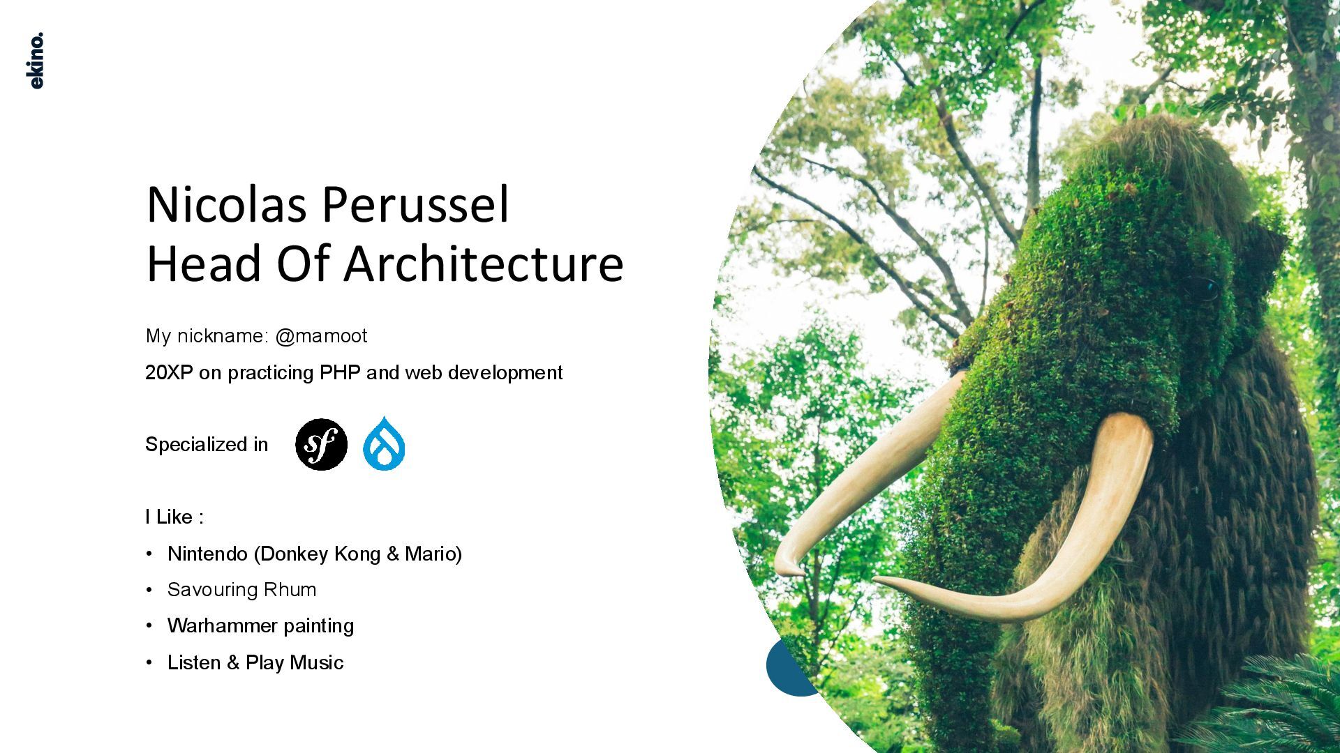 "My name is Nicolas Perussel. You can call me Mamoot. I'm Head of Architecture at Ekino. I've worked with PHP and Drupal for 20 years. I love Nintendo, rum, Warhammer, and music. Nice to meet you!"