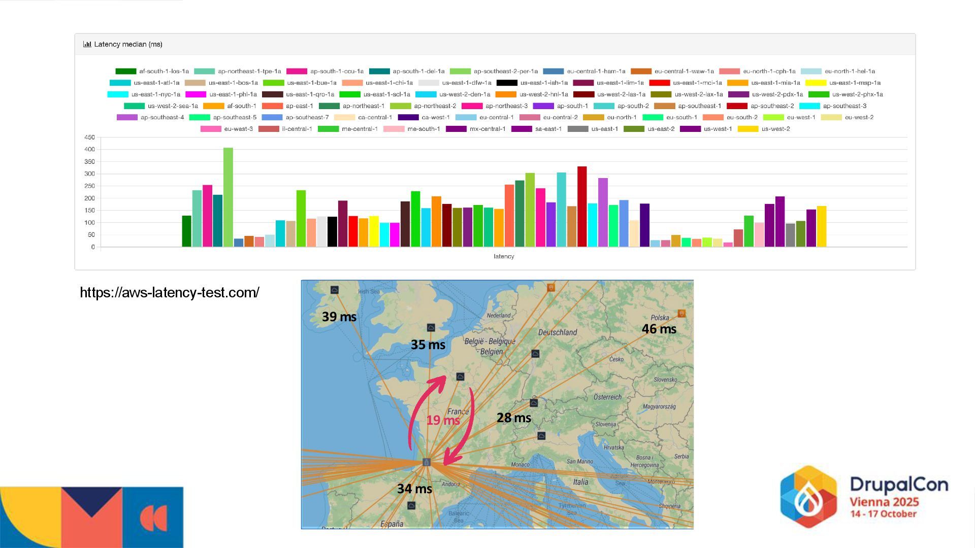 "Here's real latency data from AWS. From France to other regions. Paris to Frankfurt: 19 milliseconds. Paris to Ireland: 28 milliseconds. Paris to Stockholm: 35 milliseconds. Distance matters!"