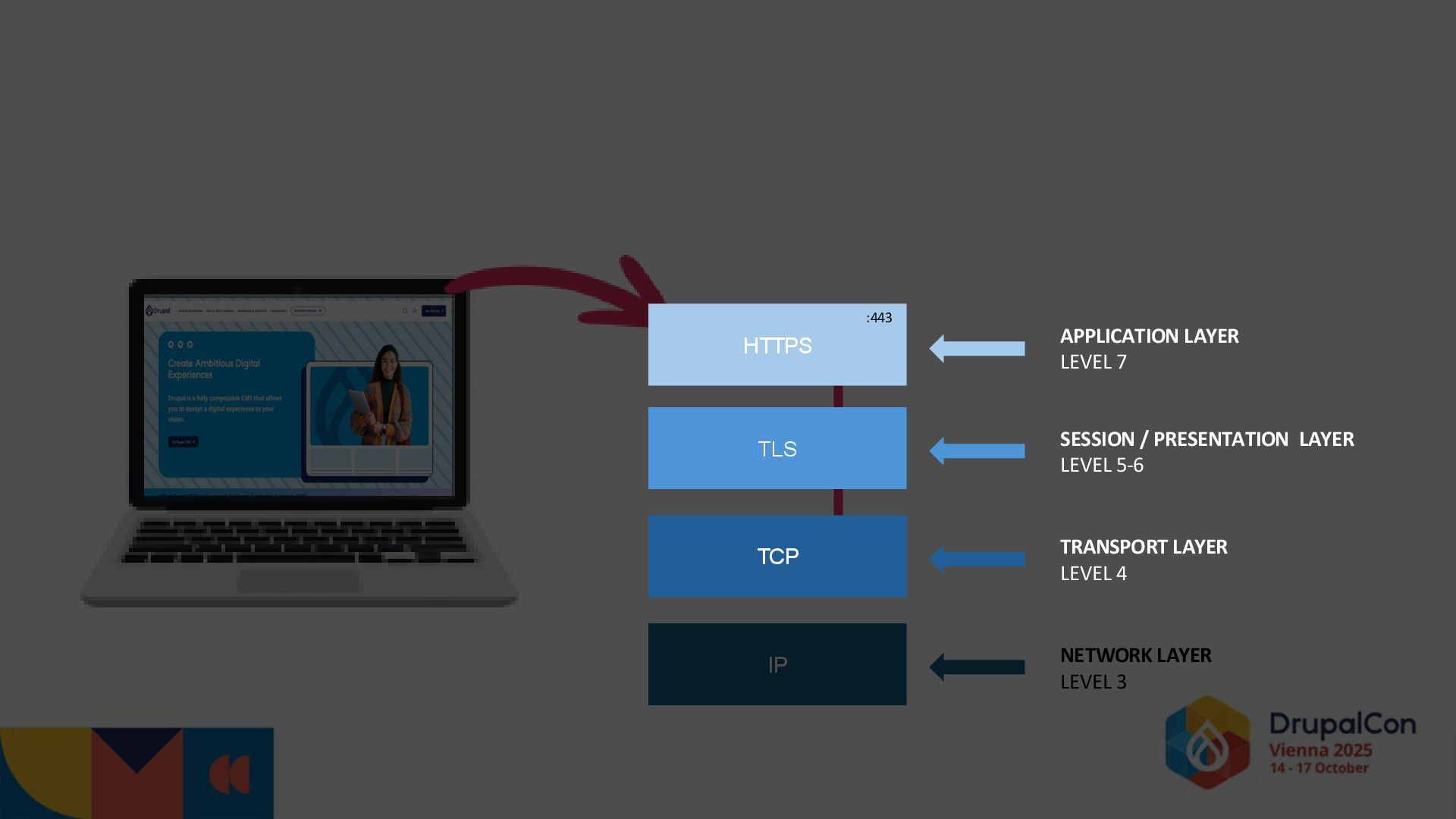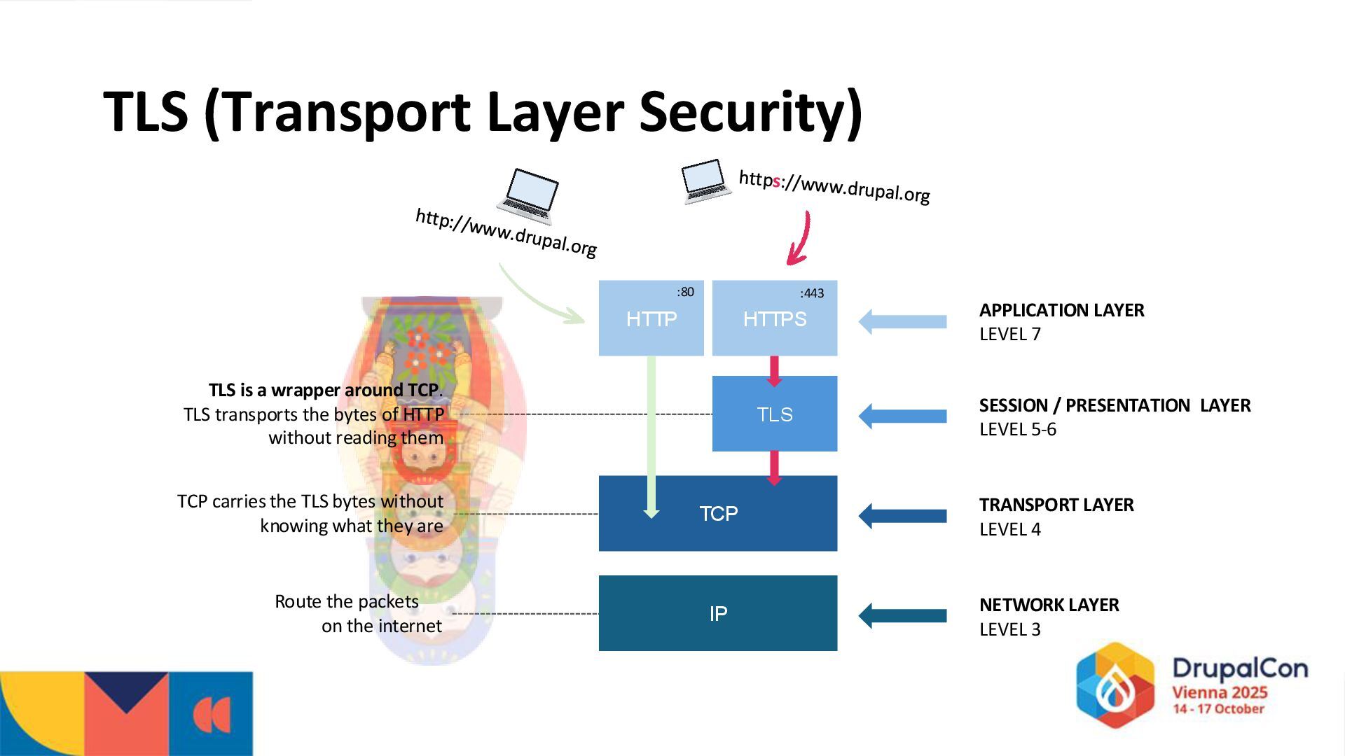 "Now let's add security. TLS. Transport Layer Security. It's Layer 5 and 6. TLS wraps TCP. HTTPS uses port 443. HTTP uses port 80. TLS transports HTTP without reading it."