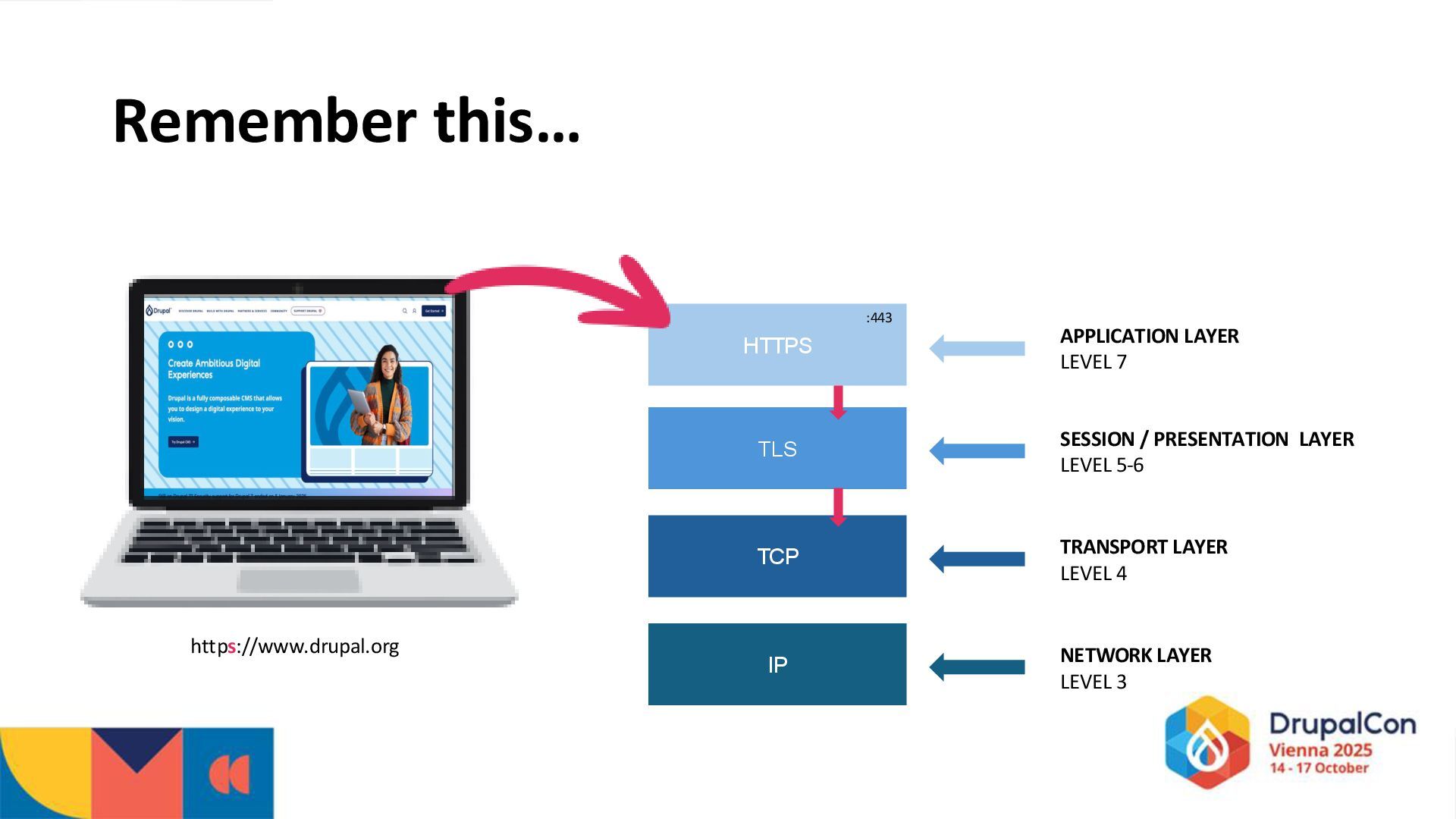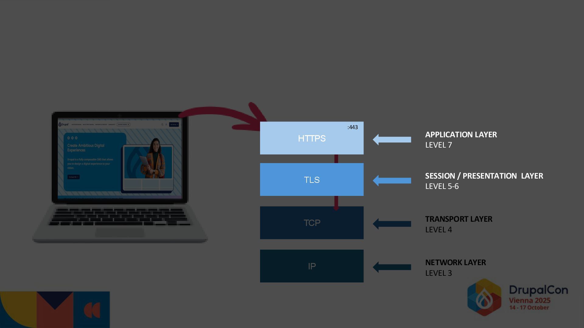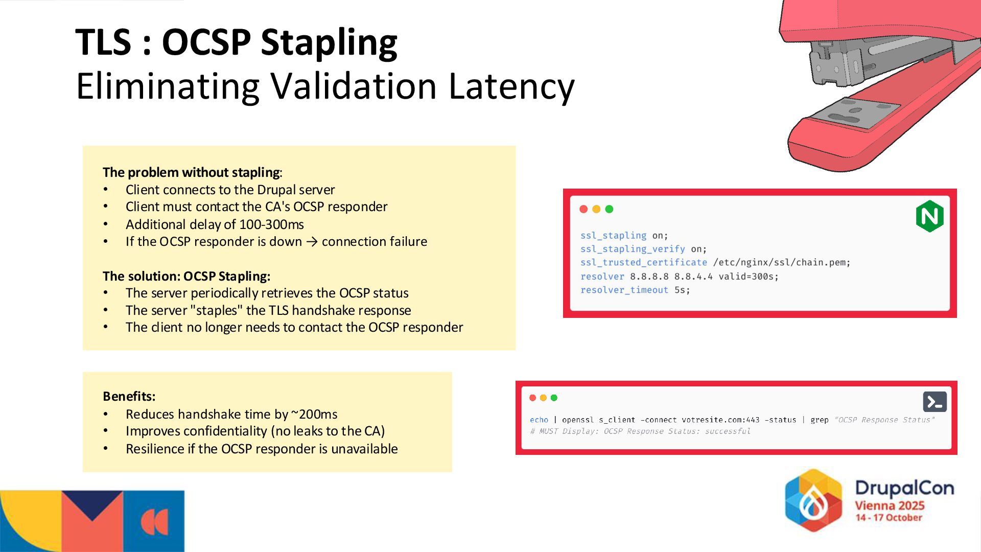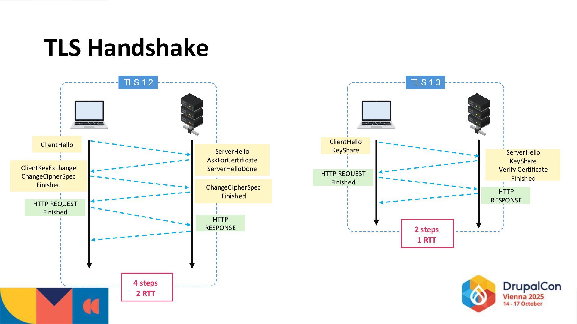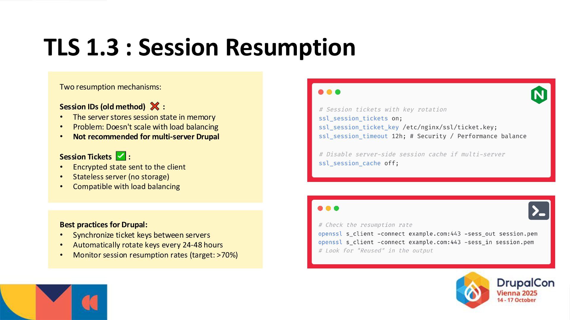 "TLS 1.3 has session resumption. Two types: Session IDs and Session Tickets. Session IDs don't scale with load balancing. Don't use them. Session Tickets are better. The server sends encrypted state to the client. No storage needed. Works with load balancers. Perfect for Drupal!"