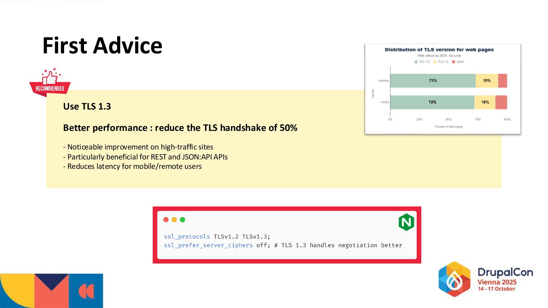 "My first advice: Use TLS 1.3. It's simple. Just two lines in nginx config. Look: ssl_protocols TLSv1.2 TLSv1.3. And ssl_prefer_server_ciphers off. That's it! Today, 73% of websites use TLS 1.3. It's the standard now."
