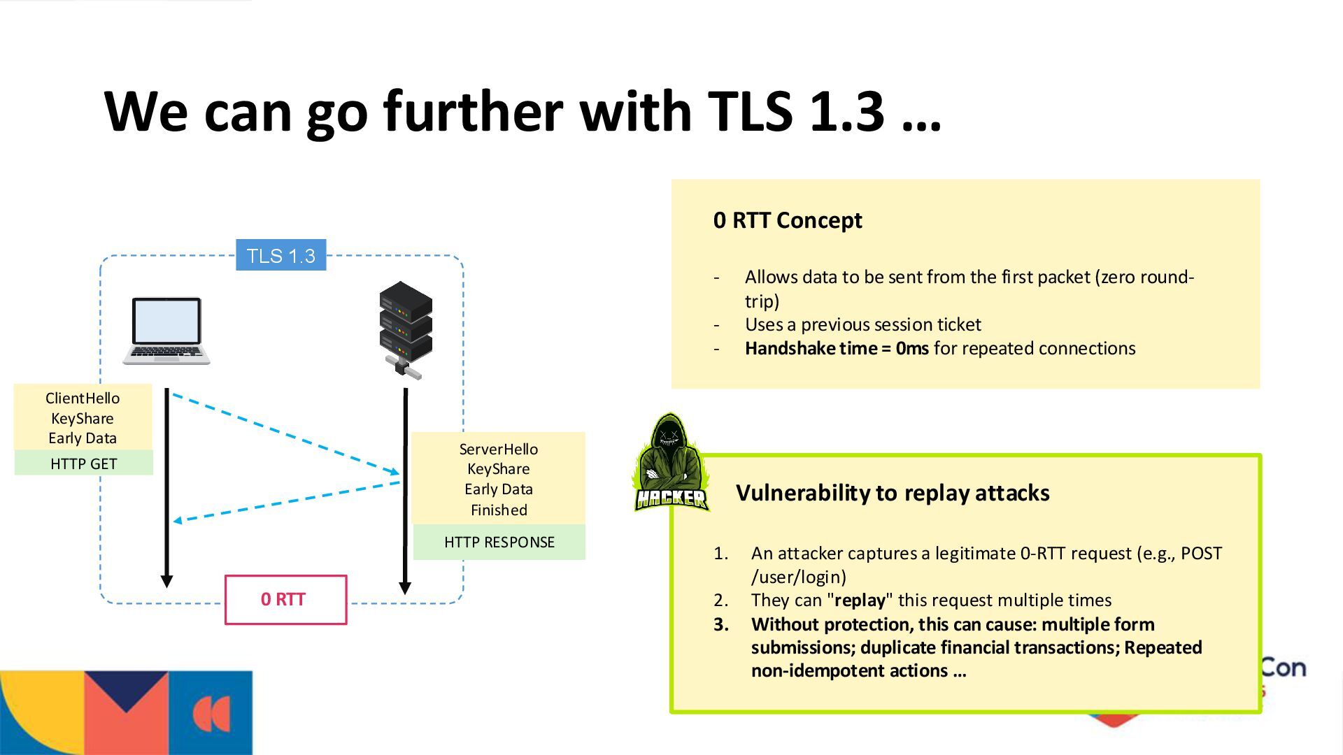 "TLS 1.3 has a cool feature. Zero RTT. The client sends data in the first packet. No waiting. Zero roundtrip. But... there's a security problem. Replay attacks."
