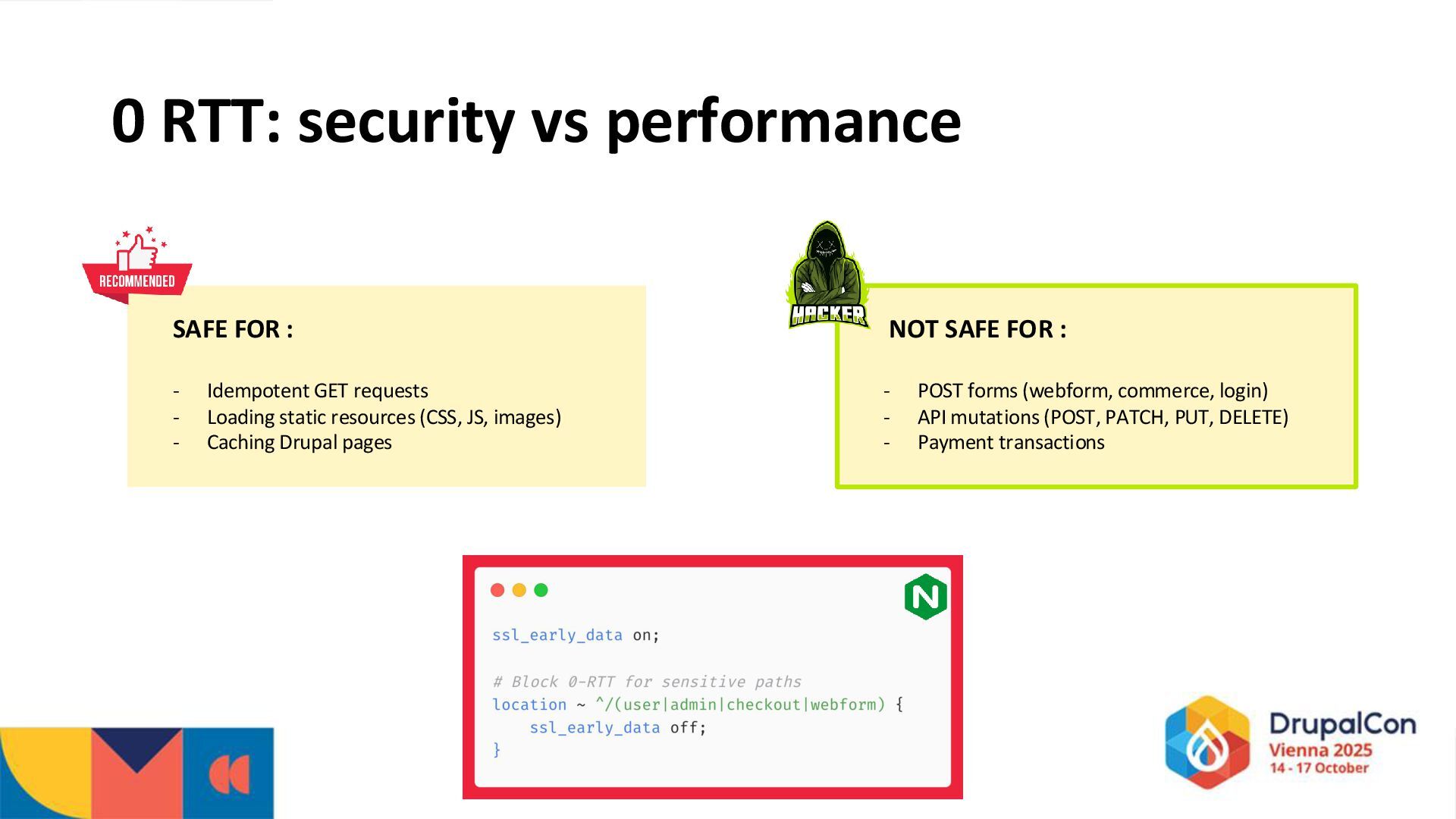 "Zero RTT is safe for GET requests. Loading CSS, JavaScript, images. Reading Drupal pages. But NOT safe for POST forms. No webforms, no commerce, no login. An attacker could replay the request many times."