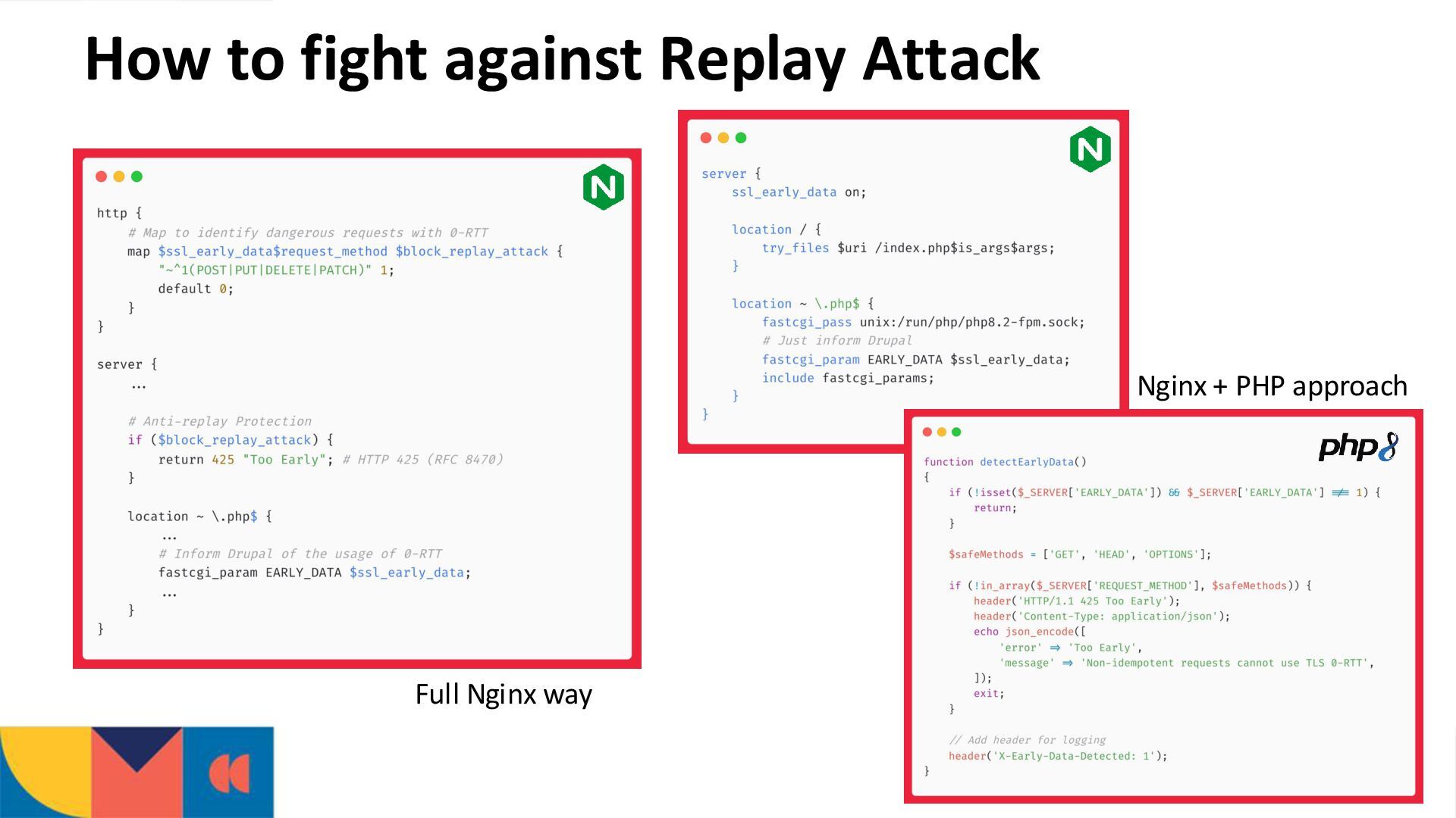 "Two ways to protect against replay attacks. Full nginx way: Block dangerous requests with a map. Or nginx plus PHP: Check the early data header in PHP. Both work well."