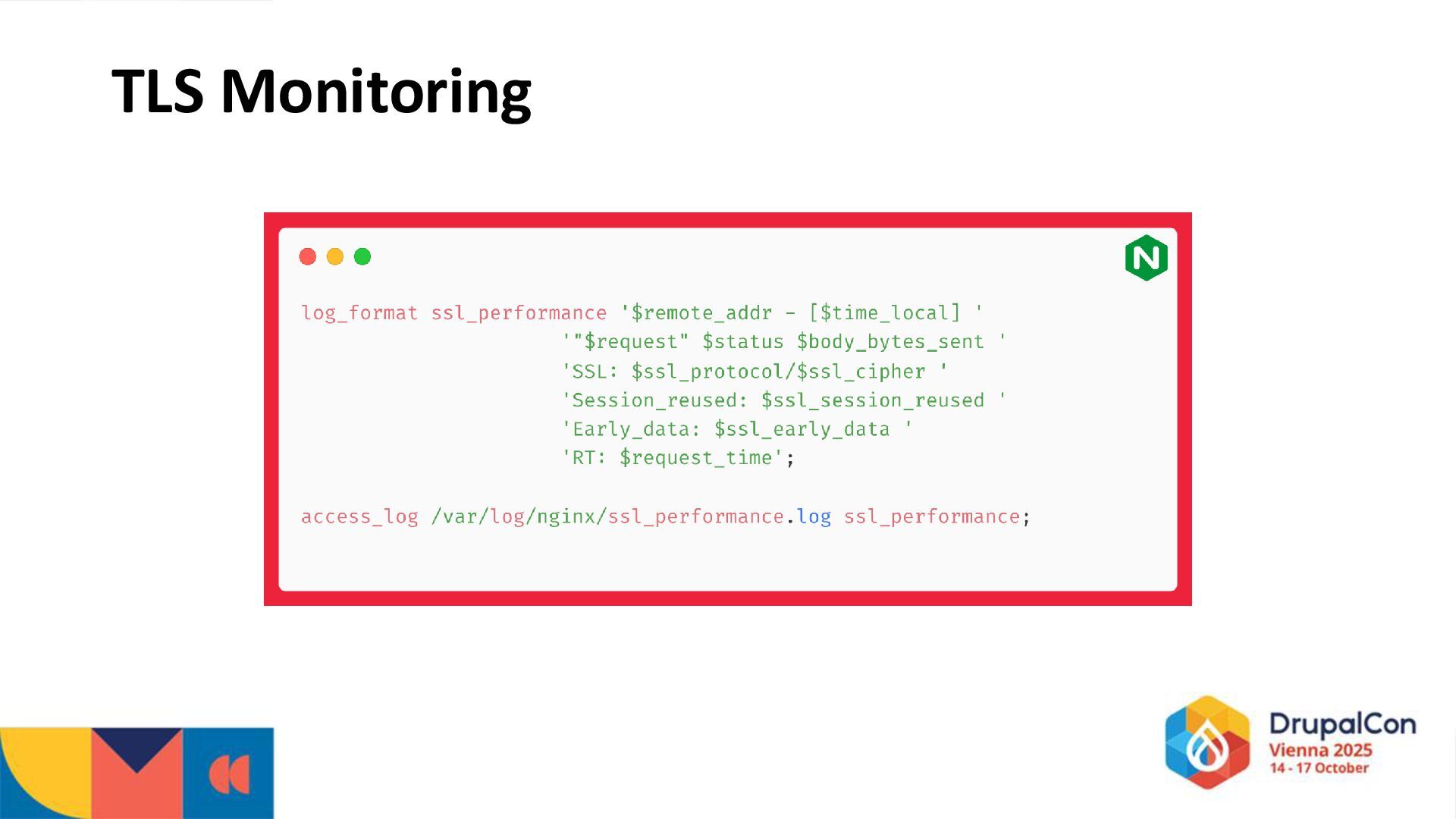 "Monitor your TLS performance. This nginx config logs everything. Protocol version, cipher, session reused, early data, request time. Very useful for debugging."