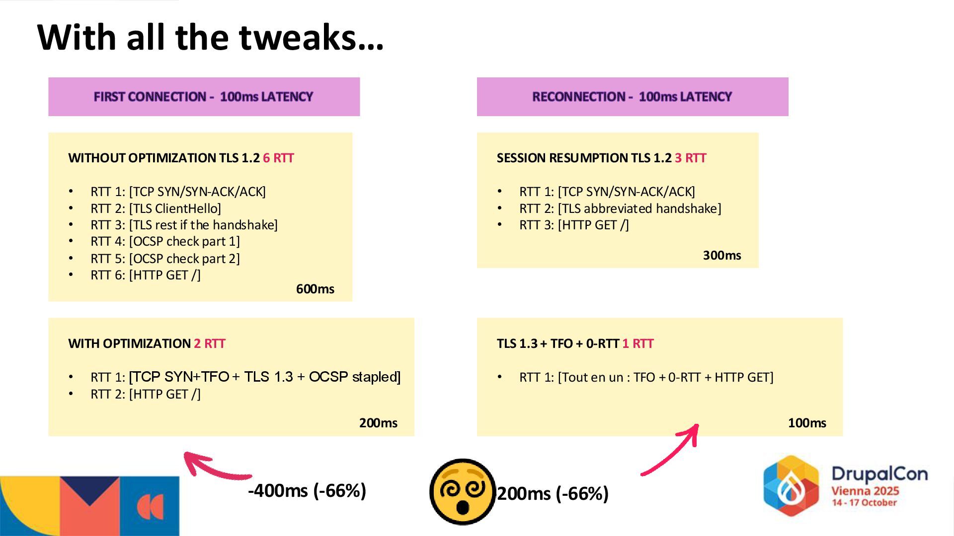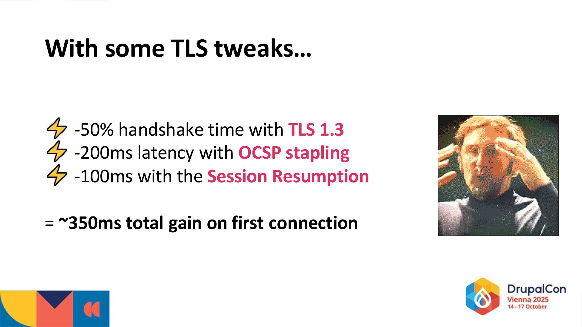 "With these TLS tweaks, we save a lot. 50% faster handshake with TLS 1.3. Minus 200 milliseconds with OCSP stapling. Minus 100 milliseconds with session resumption. Total: about 350 milliseconds saved on first connection!"