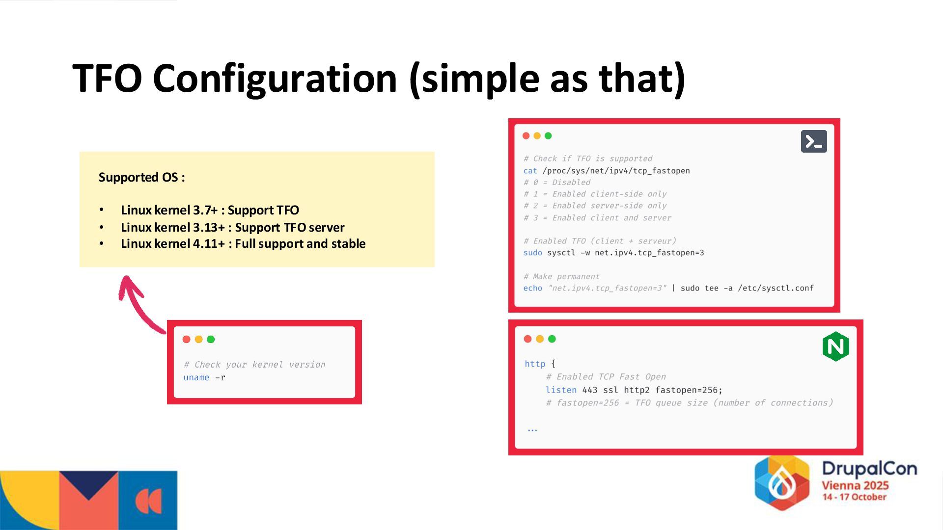 "TFO configuration is simple. Check your kernel version. You need Linux 3.7 or higher. Linux 4.11 is best. Enable it with sysctl. Then add one line to nginx config. Listen 443 ssl http2 fastopen=256. Done!"