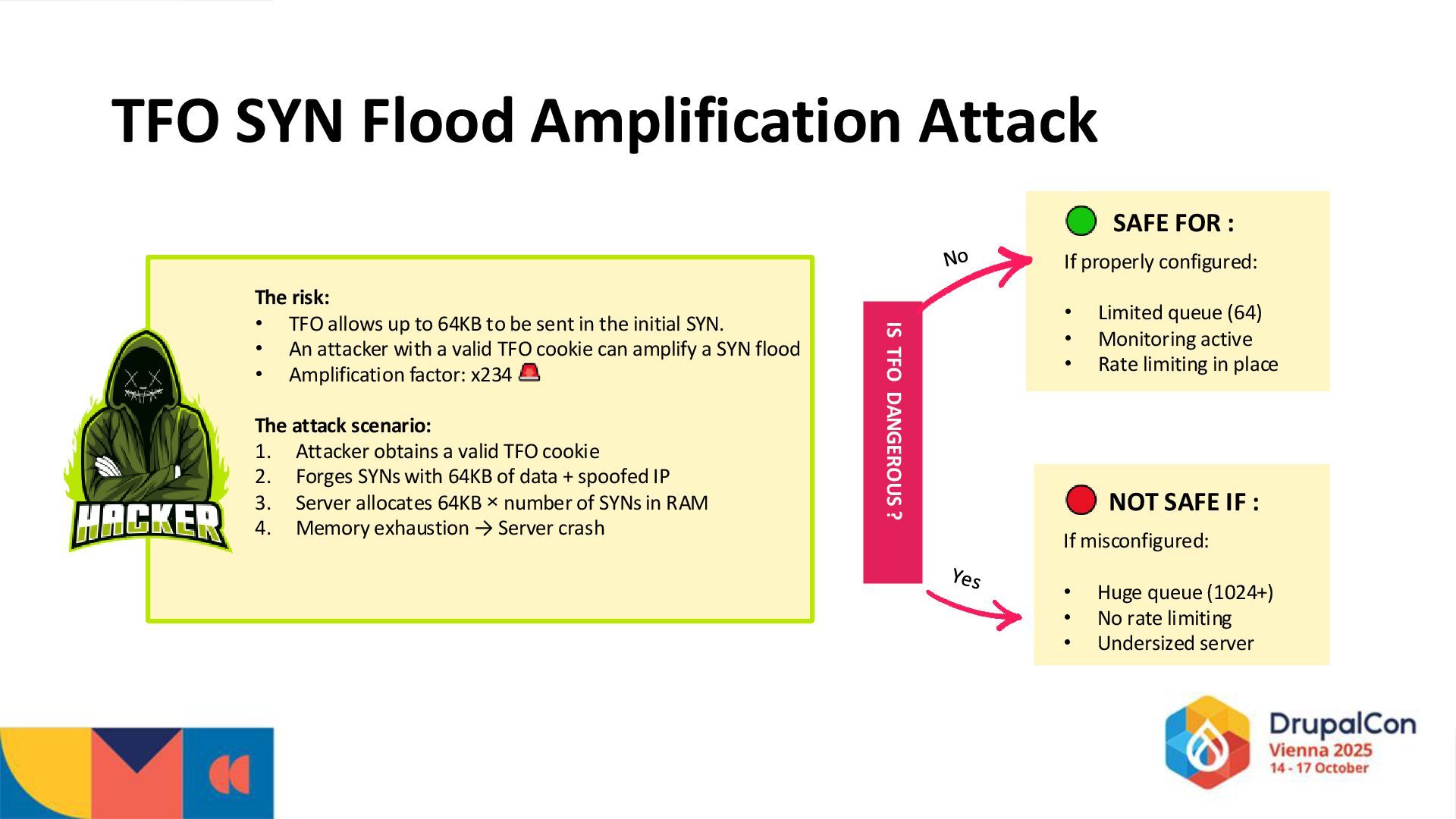 "Is TFO dangerous? There's a risk. SYN flood amplification. An attacker sends many SYNs with 64KB data. The server allocates memory for each. But if you configure it right, it's safe. Keep the queue small. Use rate limiting. Monitor your server. Then TFO is fine."