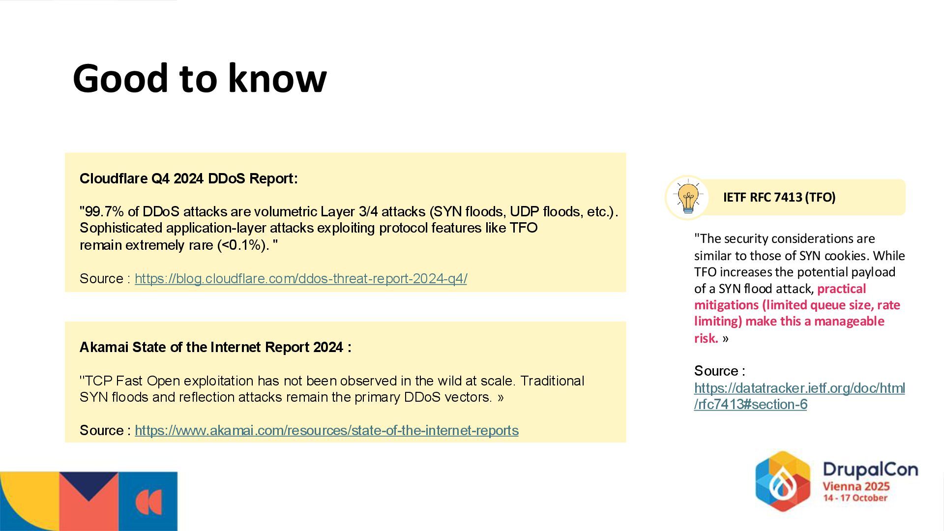 "Good news! Cloudflare says 99.7% of DDoS attacks are volumetric. TFO attacks are very rare. Less than 0.1%. Akamai confirms this. TFO exploitation is not seen at scale. The IETF RFC says the risks are manageable. So don't worry too much!"