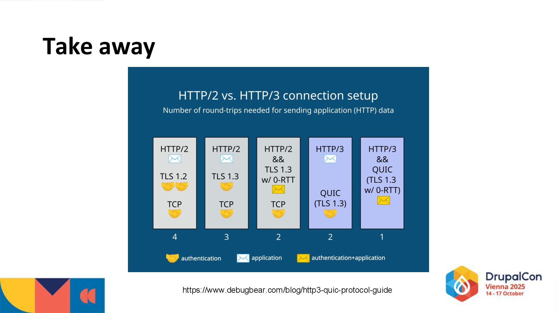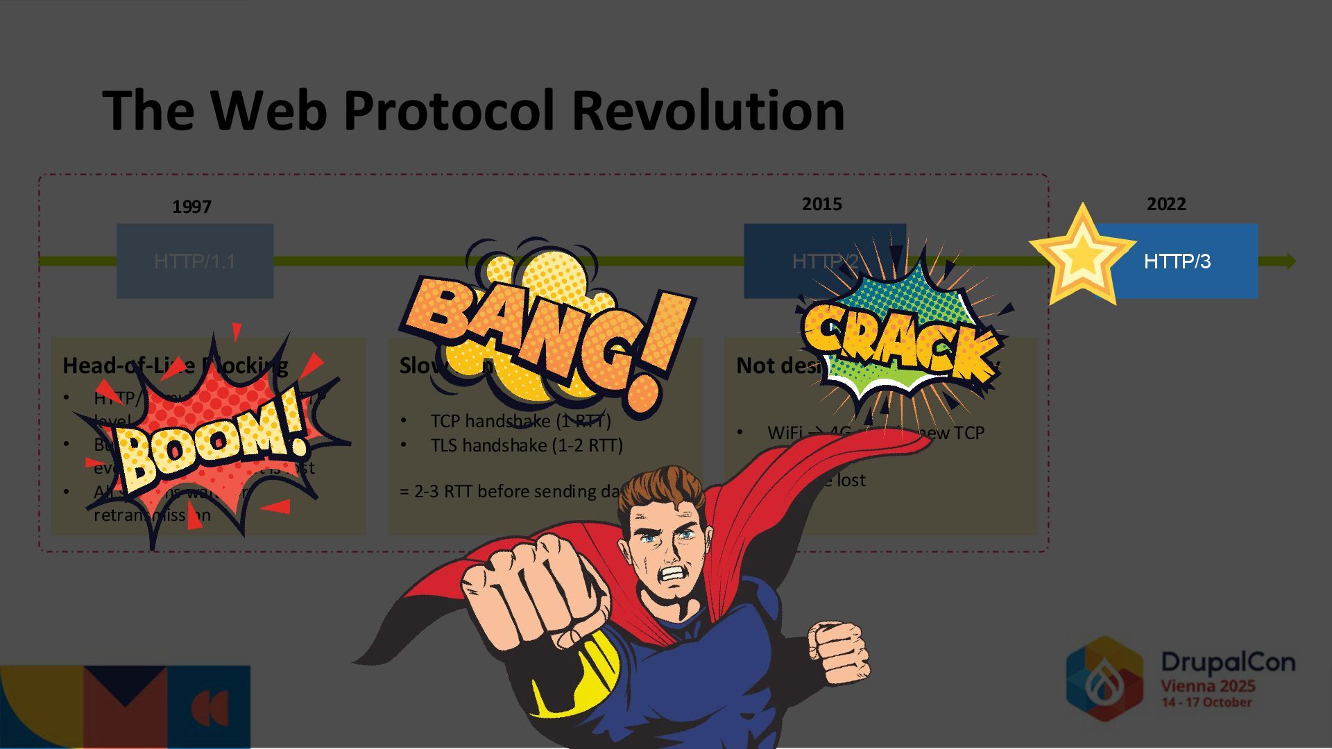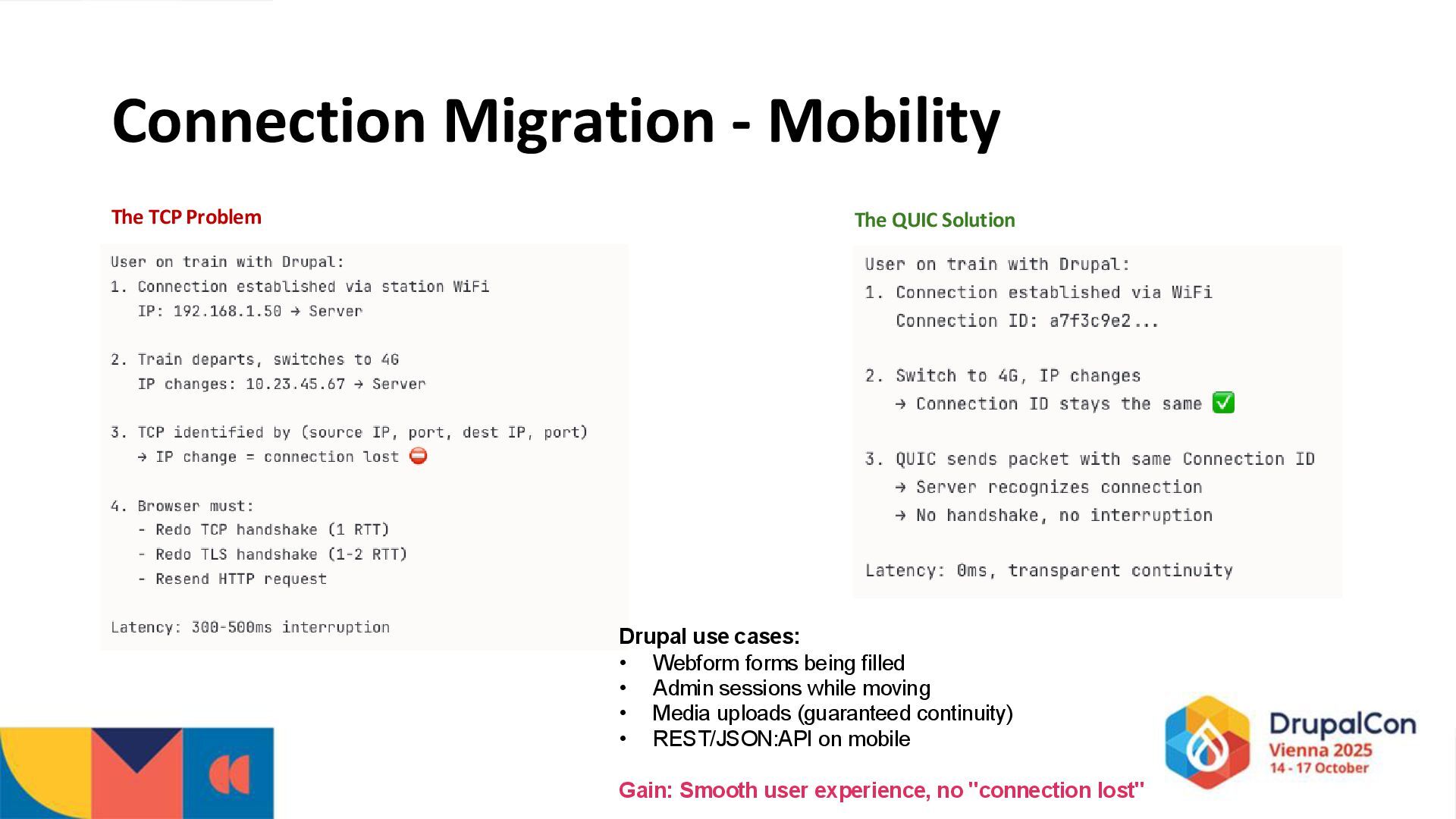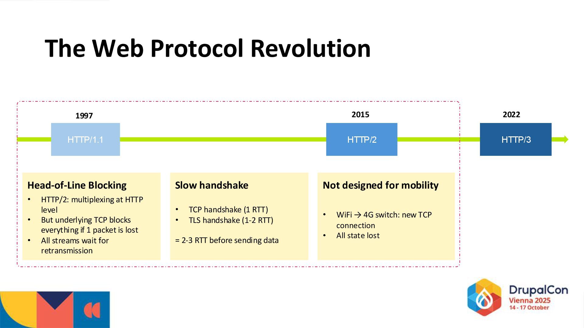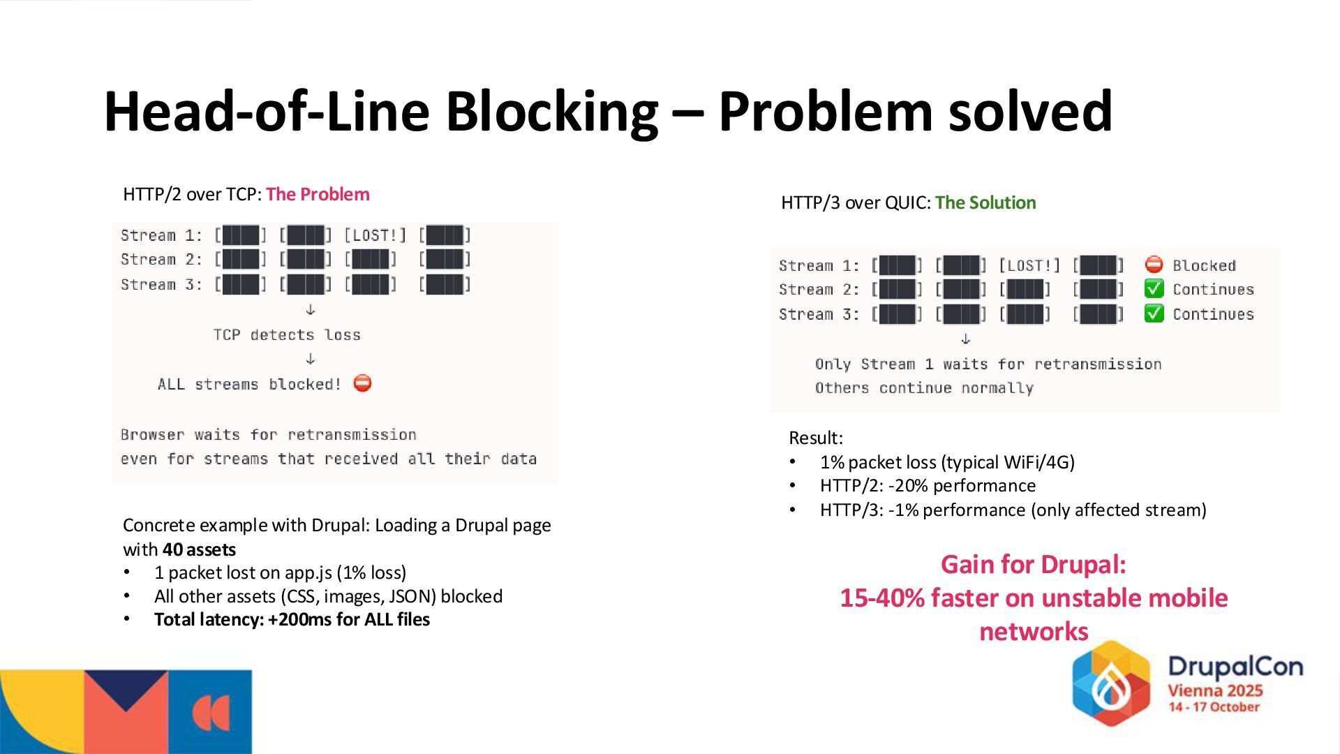 "HTTP/2 has a problem. One lost packet blocks everything. All streams wait. With Drupal, imagine 40 assets loading. One packet lost on app.js. All CSS, images, JSON blocked. Extra 200 milliseconds for everything! HTTP/3 fixes this. Only the affected stream waits. Others continue. 1% packet loss typical on mobile. HTTP/2: minus 20% performance. HTTP/3: minus 1% performance. That's 15 to 40% faster on mobile!"