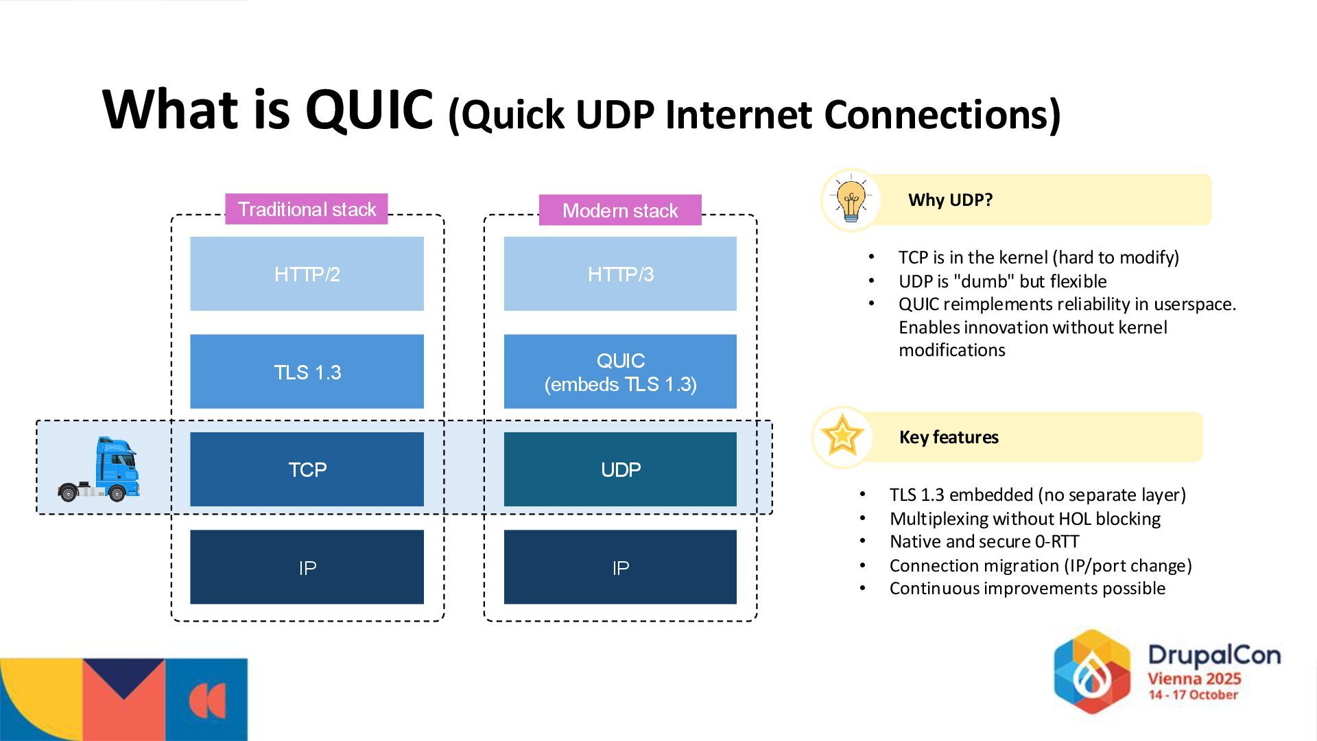 "What is QUIC? Quick UDP Internet Connections. Traditional stack uses TCP. Modern stack uses UDP. Why UDP? Because TCP is in the kernel. Hard to change. UDP is flexible. QUIC reimplements reliability in userspace. Key features: TLS 1.3 embedded. Multiplexing without blocking. Native 0-RTT. Connection migration."