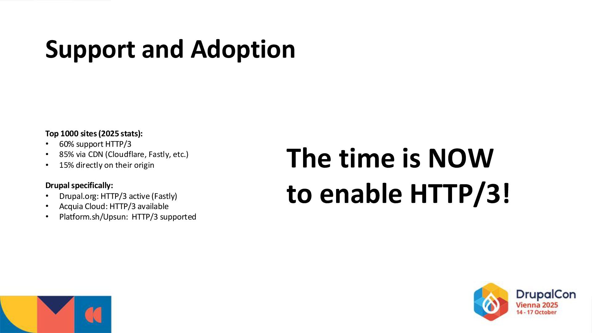 "HTTP/3 support is good now. Top 1000 sites: 60% support HTTP/3. 85% via CDN. 15% directly on origin. For Drupal: drupal.org uses HTTP/3 with Fastly. Acquia Cloud supports HTTP/3. Platform.sh supports HTTP/3. The time is NOW to enable HTTP/3!"
