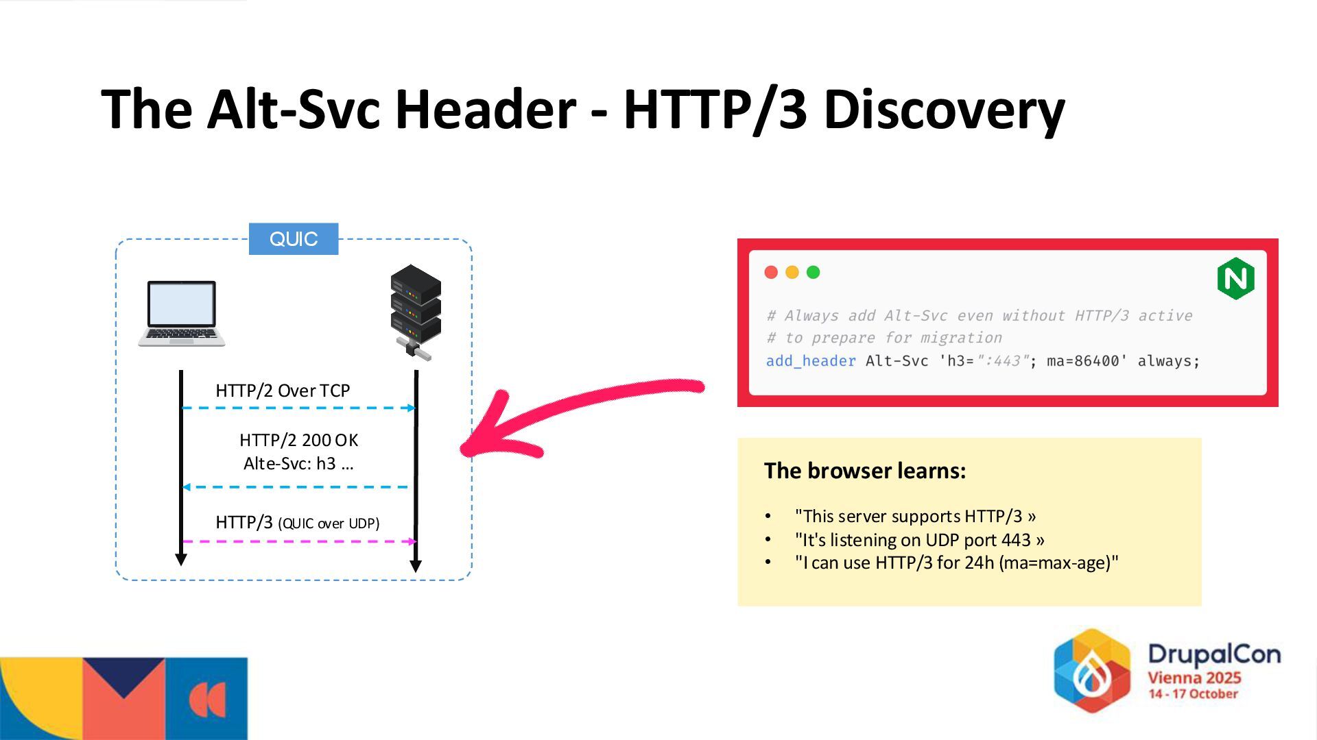 "How does HTTP/3 discovery work? The Alt-Svc header. The browser connects with HTTP/2 over TCP first. The server responds with Alt-Svc: h3. The browser learns: this server supports HTTP/3. It's on UDP port 443. I can use it for 24 hours. Always add this header. Even without HTTP/3 active. Prepare for migration!"