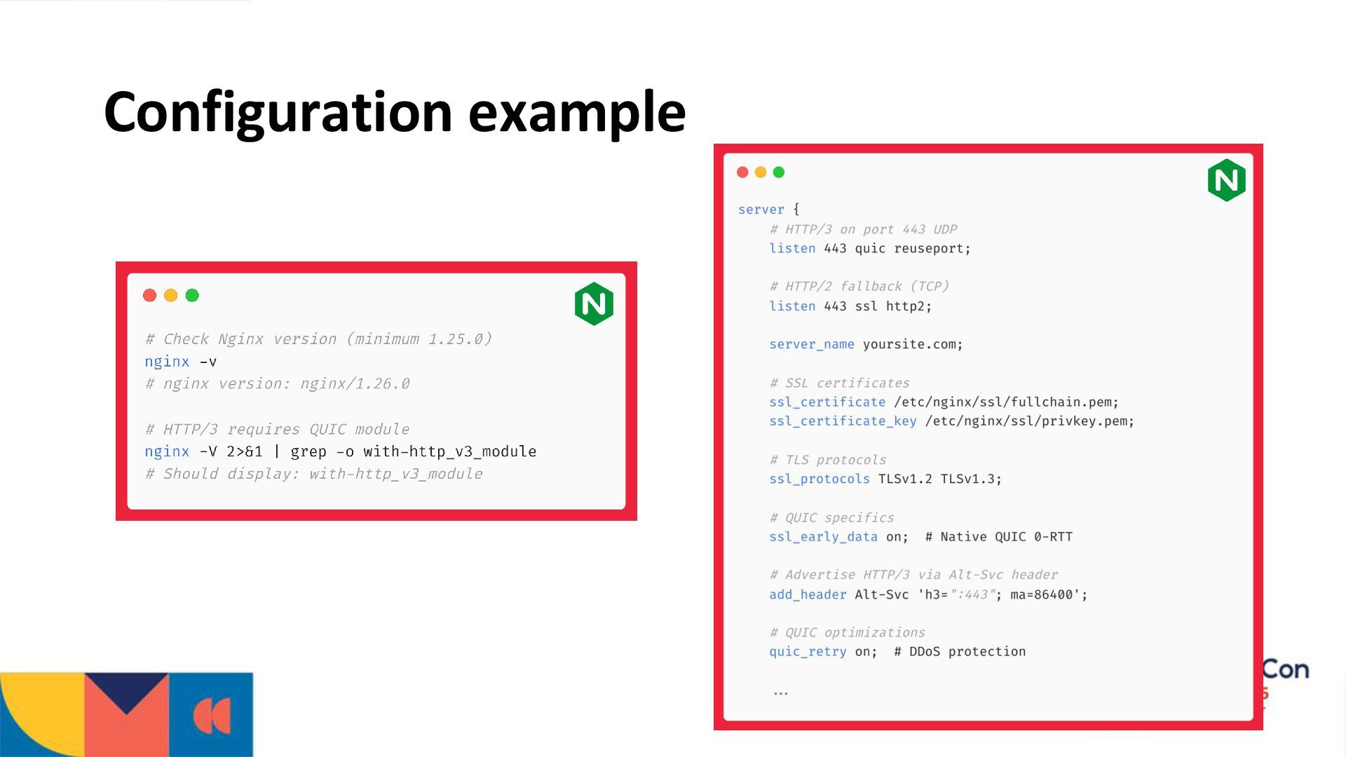 "Configuration is easy. Check nginx version. Minimum 1.25.0. Check if QUIC module is compiled. Add three lines to nginx config. Listen 443 quic reuseport. Listen 443 ssl http2 for fallback. Add the Alt-Svc header. Enable TLS 1.3. Enable early data for 0-RTT. Enable quic_retry for DDoS protection. That's it!"