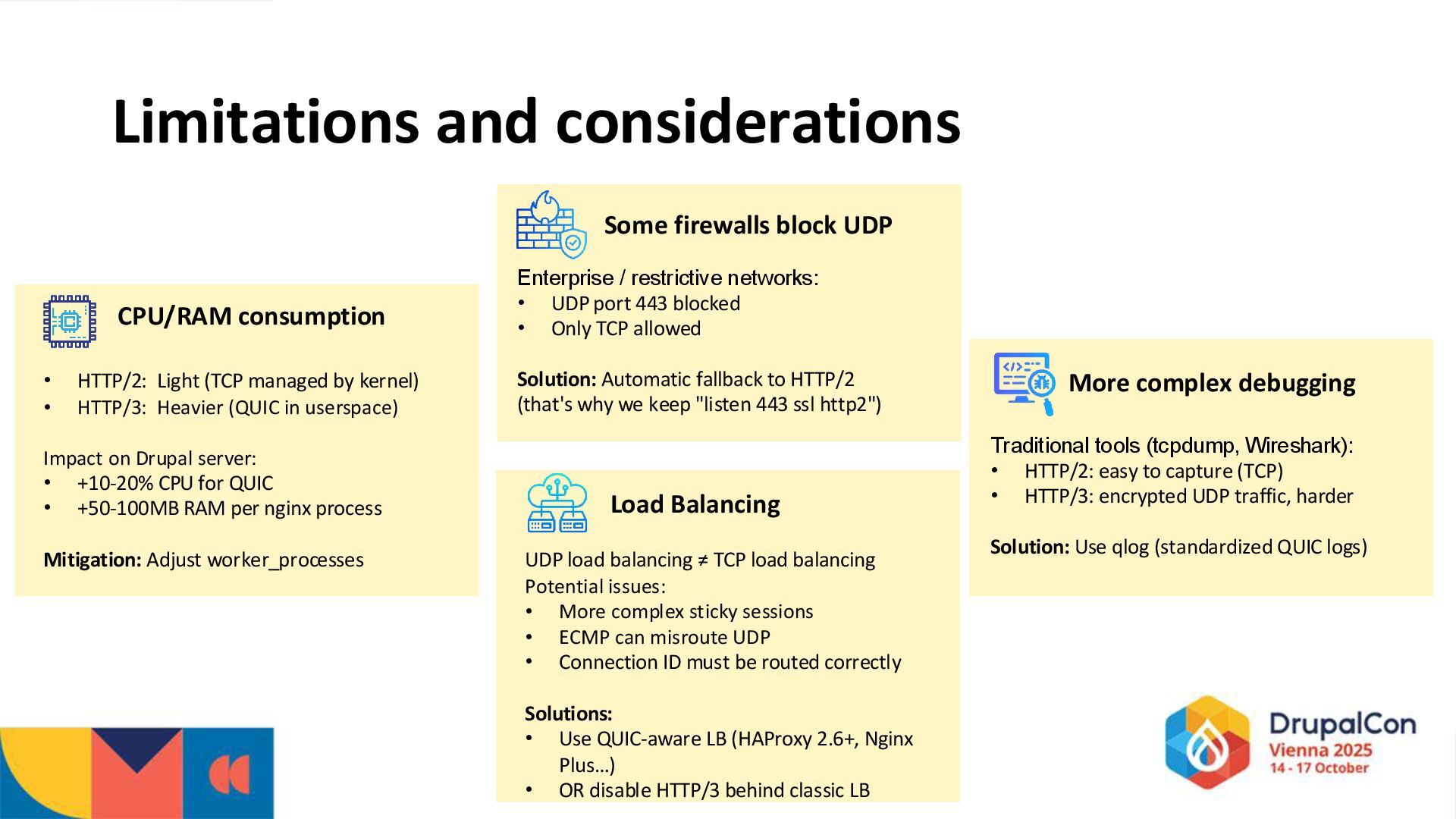 "HTTP/3 has some limitations. Four things to consider. First, CPU and RAM consumption. HTTP/3 uses more resources. 10 to 20% more CPU. 50 to 100 MB more RAM per process. Second, some firewalls block UDP. Enterprise networks especially. Solution: automatic fallback to HTTP/2. That's why we keep both. Third, load balancing. UDP load balancing is different. You need QUIC-aware load balancers. Like HAProxy 2.6 or nginx Plus. Or disable HTTP/3 behind classic load balancers. Fourth, debugging is harder. Encrypted UDP traffic. Use qlog for debugging. It's standardized QUIC logs."