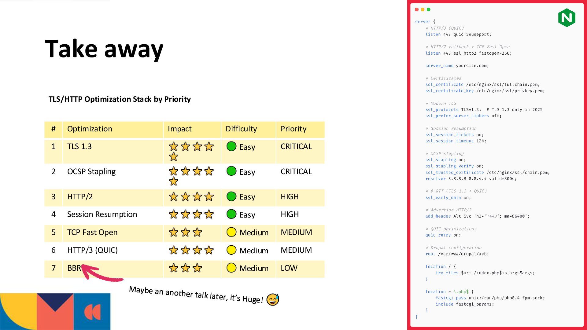 "My recommendations by priority. Number one: TLS 1.3. Easy to implement. Critical impact. Do this first! Number two: OCSP Stapling. Also easy. Also critical. Number three: HTTP/2. Easy and high impact. Number four: Session Resumption. Easy and high impact. Number five: TCP Fast Open. Medium difficulty. Medium priority. Number six: HTTP/3 with QUIC. Medium difficulty. Medium priority. Number seven: BBR. Medium difficulty. Low priority. Maybe another talk later!"