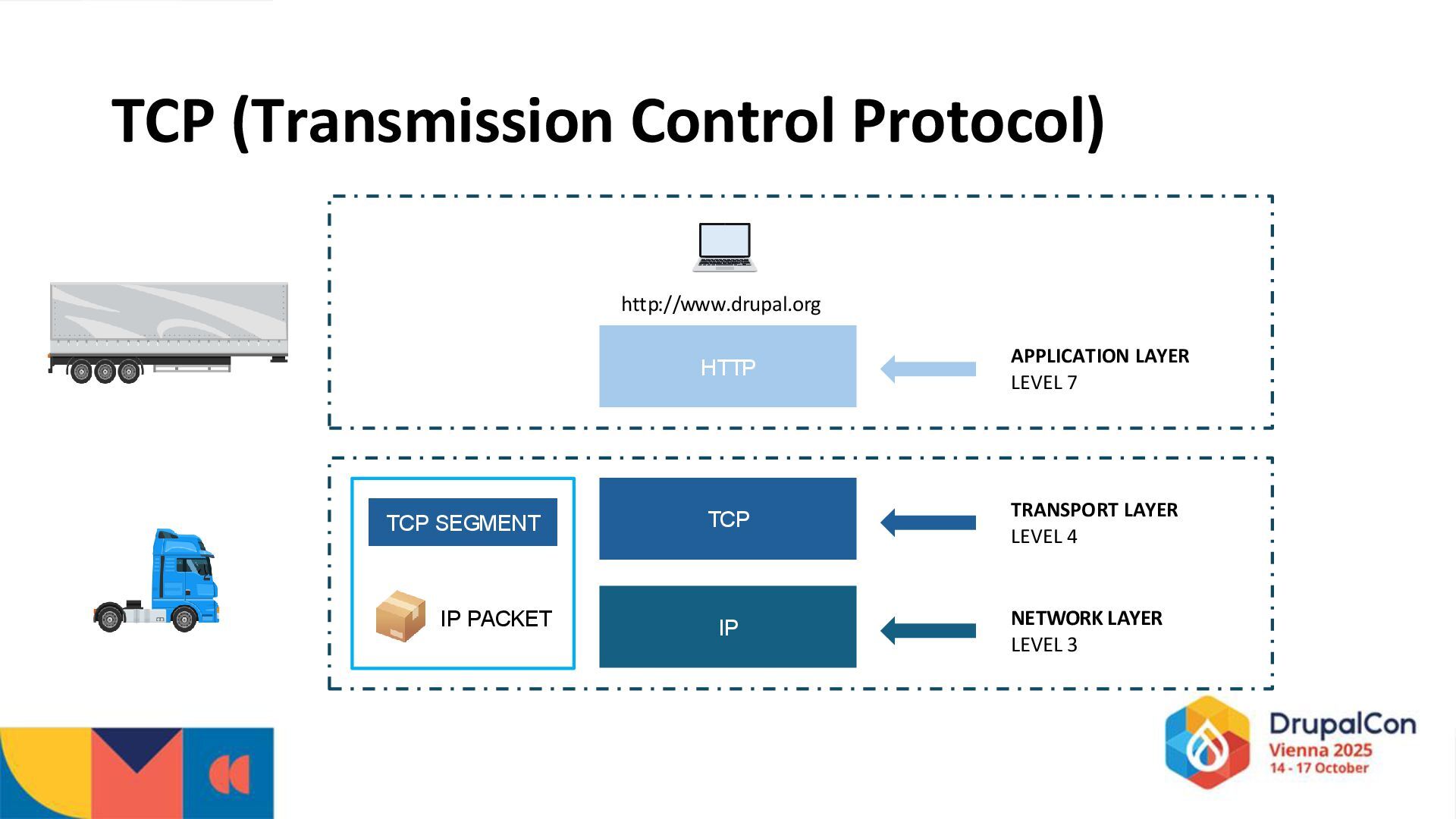 "Let me introduce TCP. Transmission Control Protocol. It's Layer 4. The transport layer. TCP carries your HTTP requests. It's like a truck carrying packages."