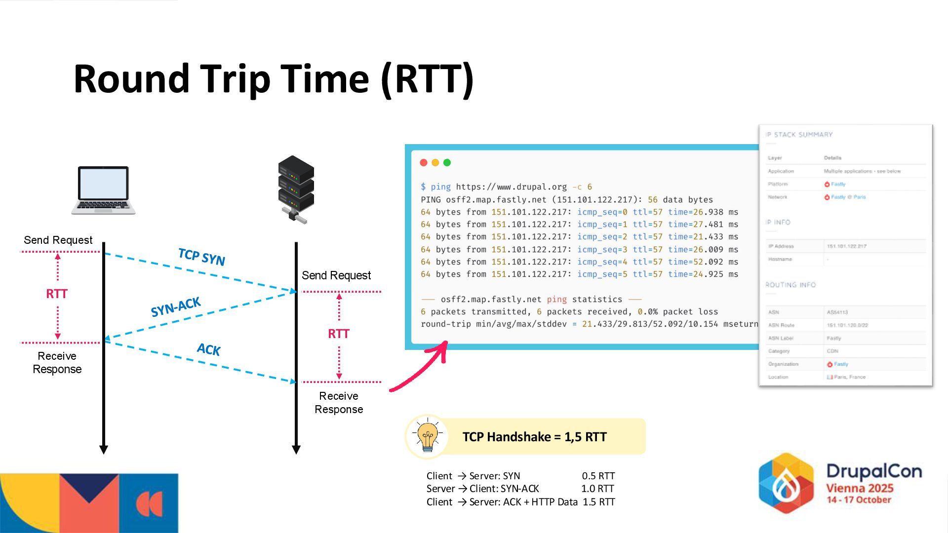 "This handshake takes time. We call it RTT. Round Trip Time. One RTT is the time for data to go back and forth. TCP handshake takes 1.5 RTT. Look at this ping example. From France to drupal.org. About 26 milliseconds average."