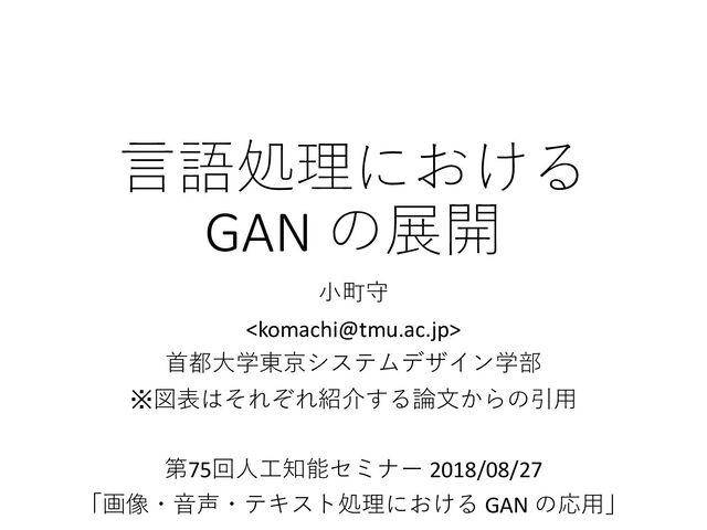 Nets with Policy Gradient (AAAI 2017; 初出 arXiv:1609) • Zhang et al. Feature Matching for Text Generation (ICML 2017; textGAN) • Fedus et al. MaskGAN: Better Text Generation via Filling in the ____ (ICLR 2018) ⾔語処理における GAN の展開 11 2018/8/27