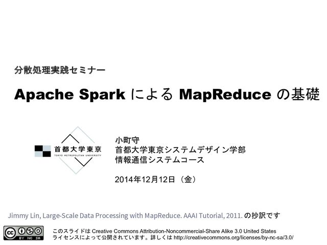 首都大学東京で2014年12月に開催された「分散処理実践セミナー Apache Spark による MapReduce の基礎」の講義部分のスライドです。Jimmy Lin, Large-Scale Data Processing with MapReduce. AAAI Tutorial, 2011. の抄訳なので、基本的にはオリジナルをご参照ください。