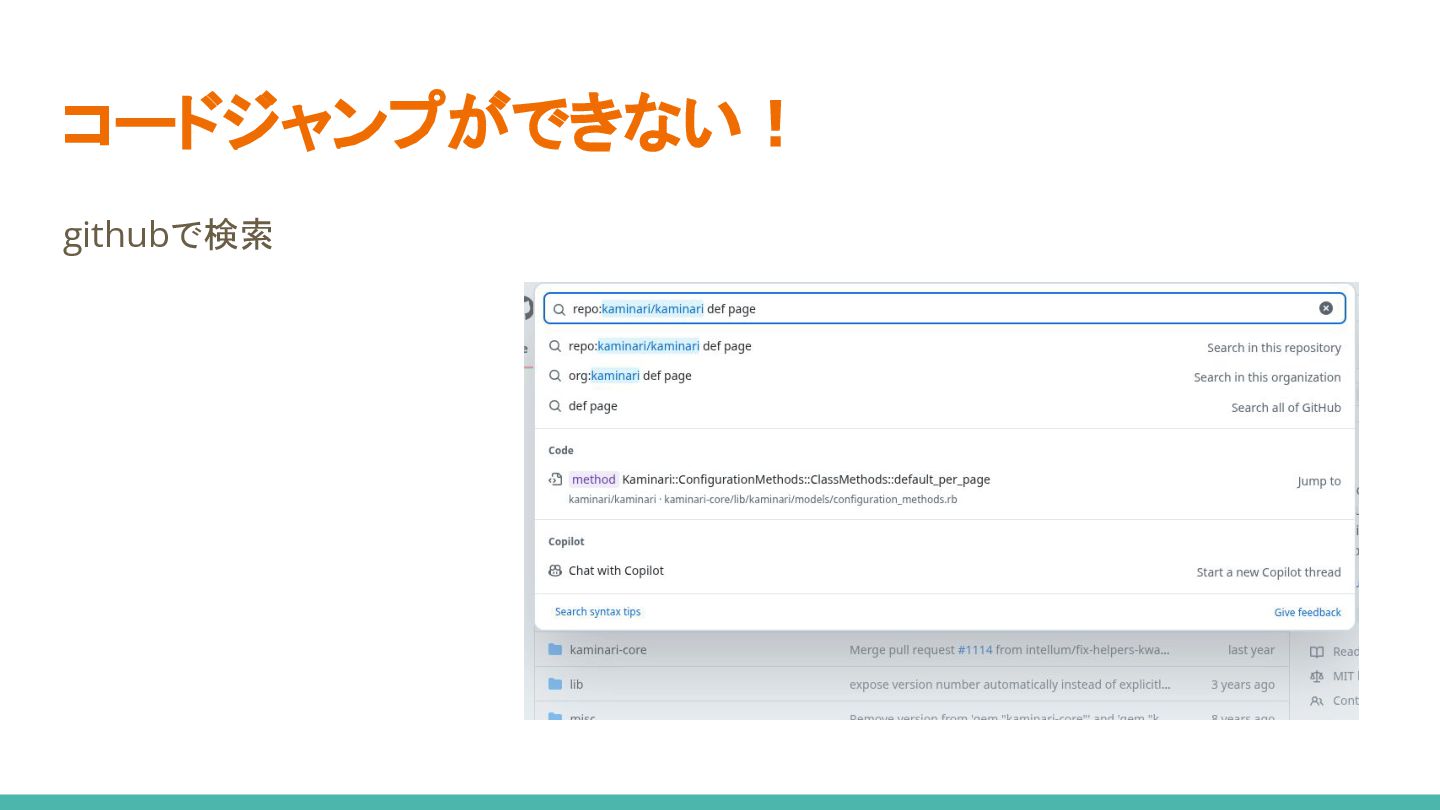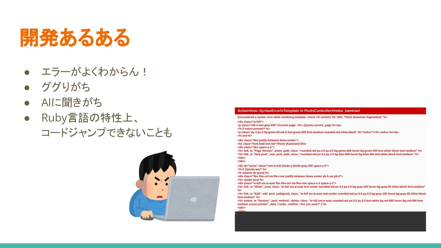 開発あるある • エラーがよくわからん! • ググりがち • AIに聞きがち • Ruby言語の特性上、 コードジャンプできないことも