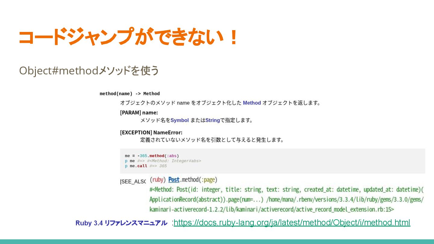 コードジャンプができない! Ruby 3.4 リファレンスマニュアル :https://docs.ruby-lang.org/ja/latest/method/Object/i/method.html Object#methodメソッドを使う