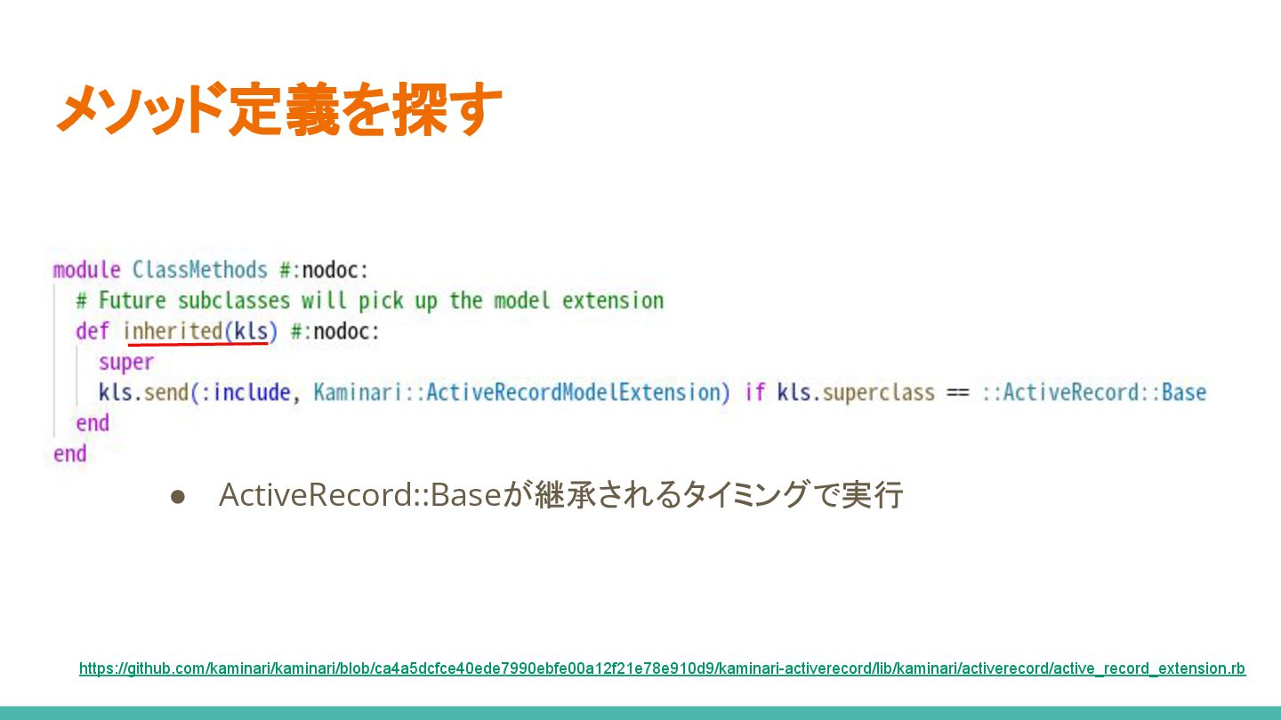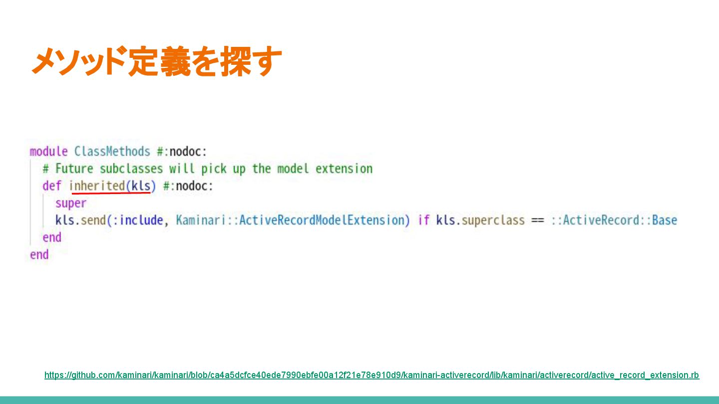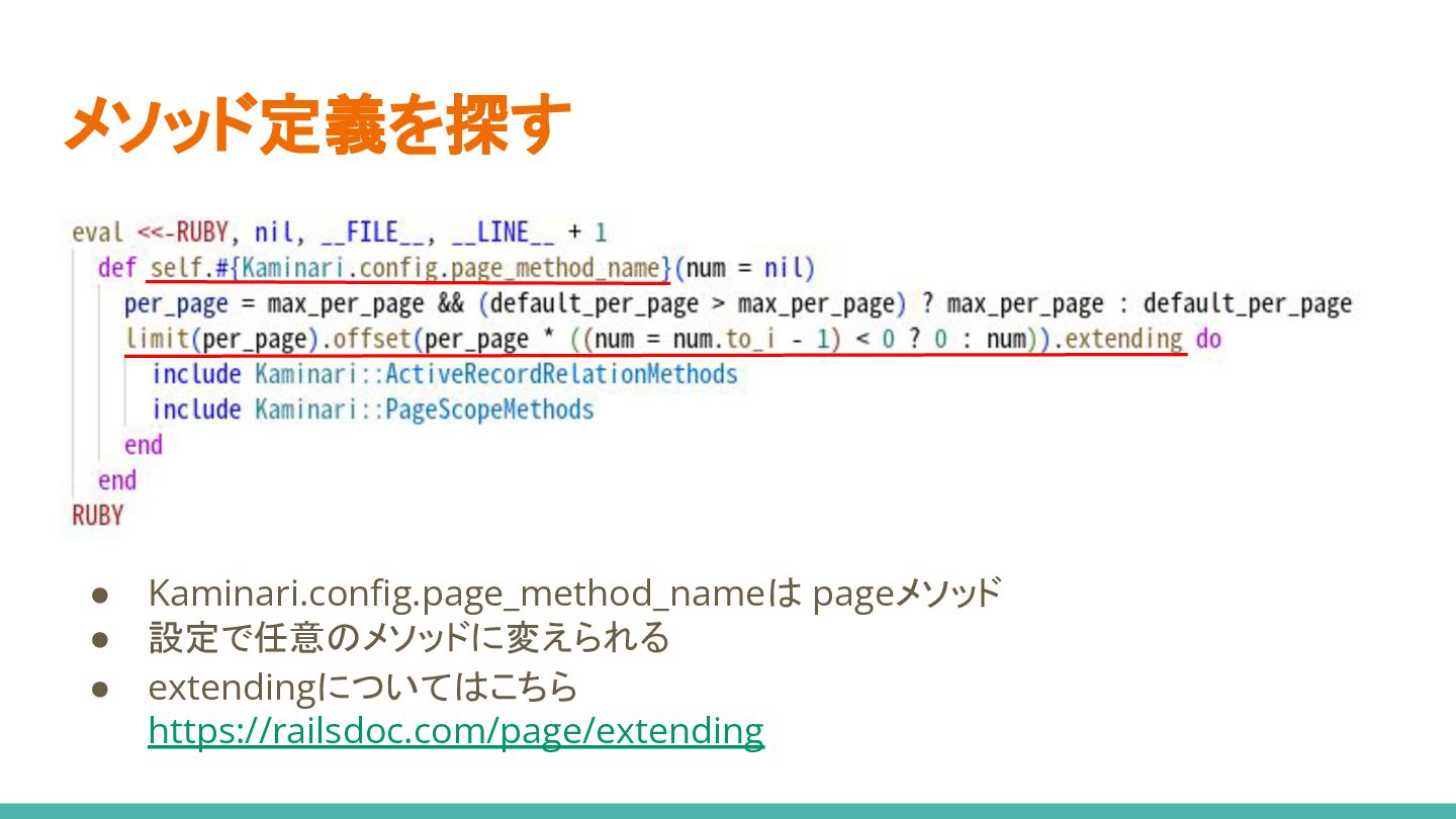 メソッド定義を探す https://github.com/kaminari/kaminari/blob/ca4a5dcfce40ede7990ebfe00a12f21e78e910d9/kaminari-activerecord/lib/kaminari/activerecord/active_record_extension.rb • ActiveRecord::Baseが継承されるタイミングで実行