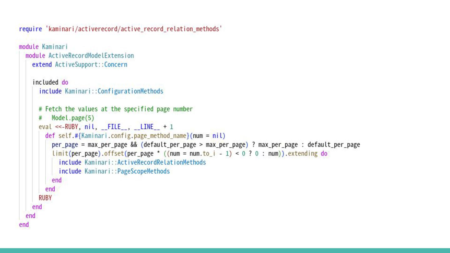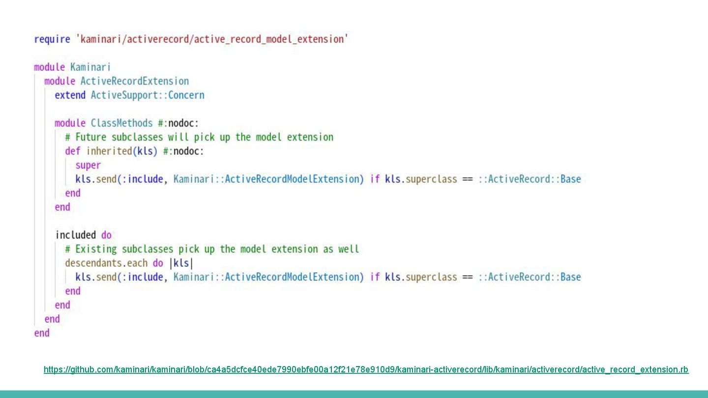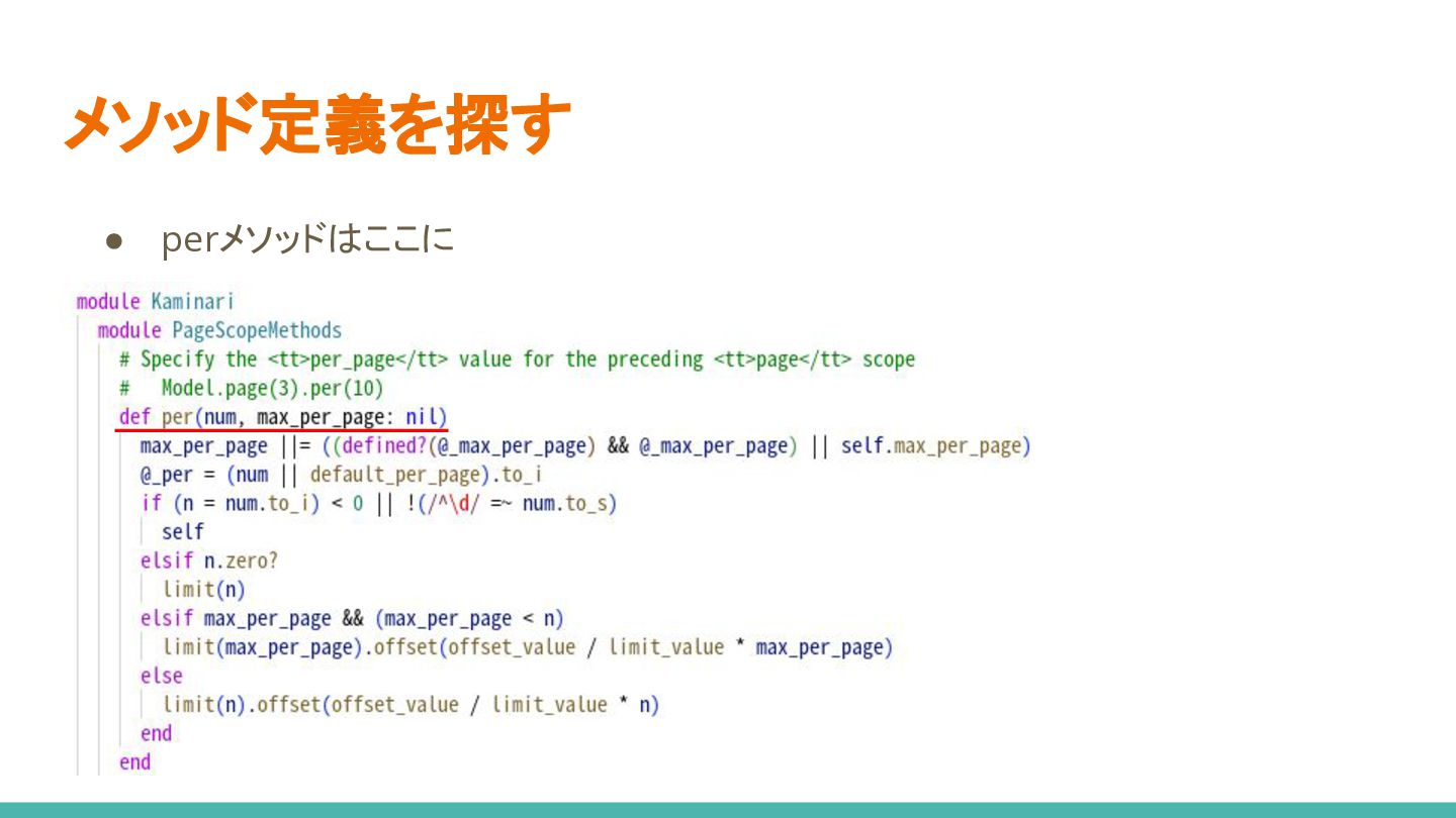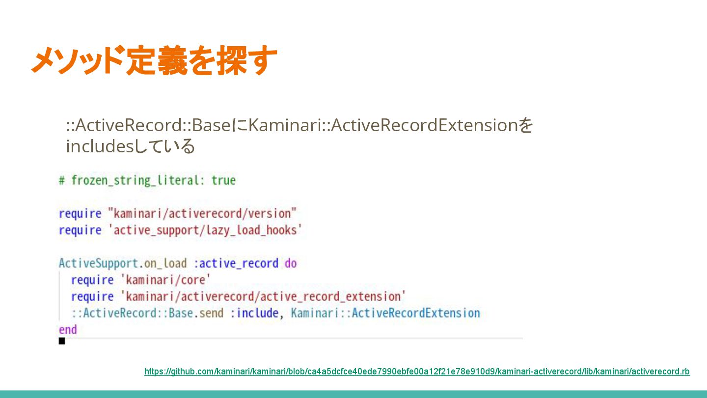 メソッド定義を探す https://github.com/kaminari/kaminari/blob/ca4a5dcfce40ede7990ebfe00a12f21e78e910d9/kaminari-activerecord/lib/kaminari/activerecord/active_record_extension.rb • ActiveRecord::Baseが継承されるタイミングで実行