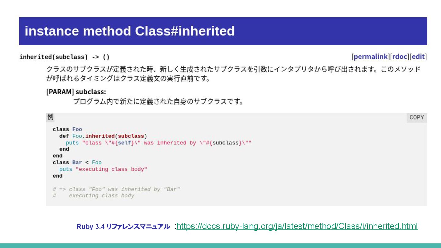 Ruby 3.4 リファレンスマニュアル :https://docs.ruby-lang.org/ja/latest/method/Class/i/inherited.html