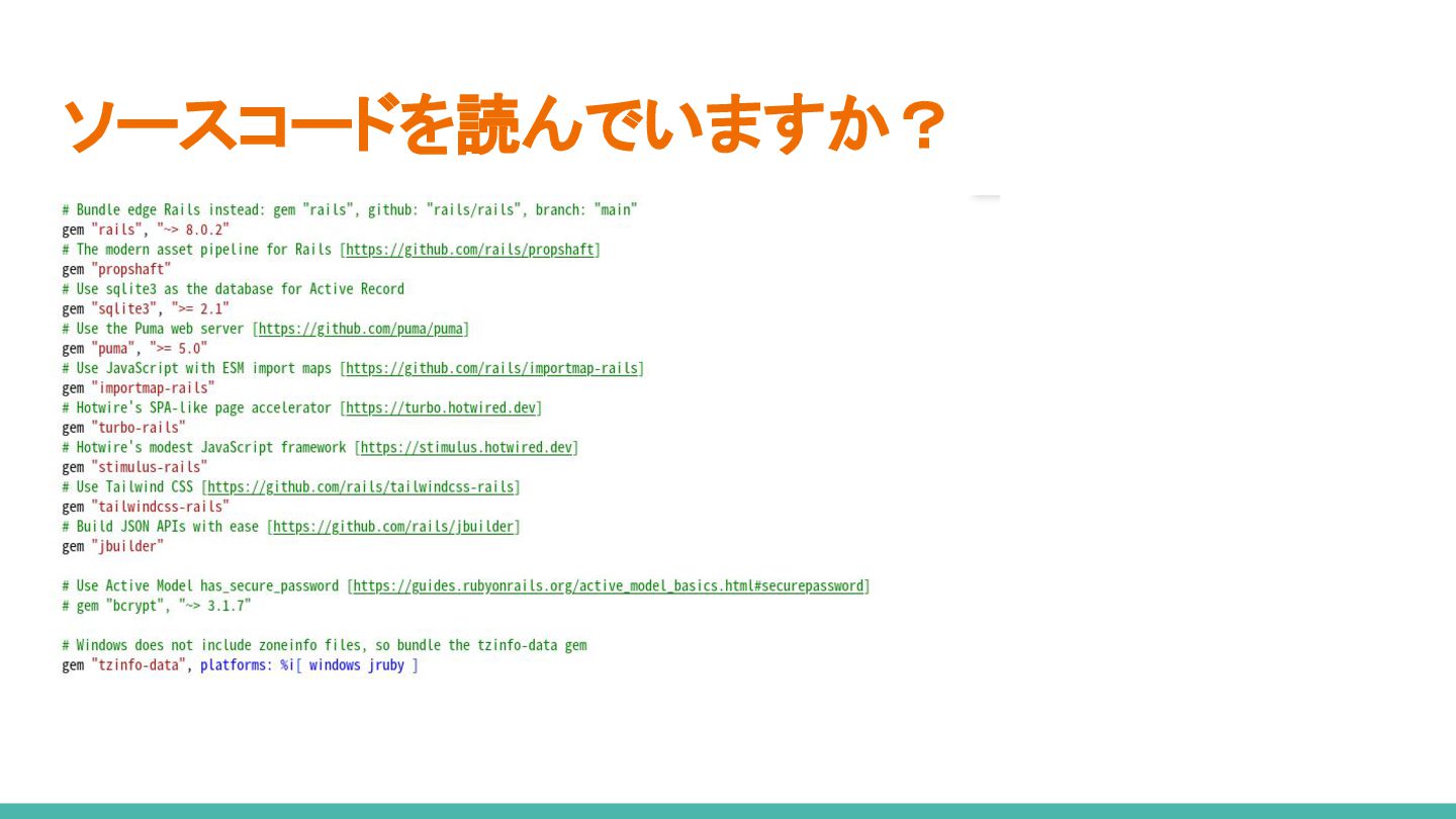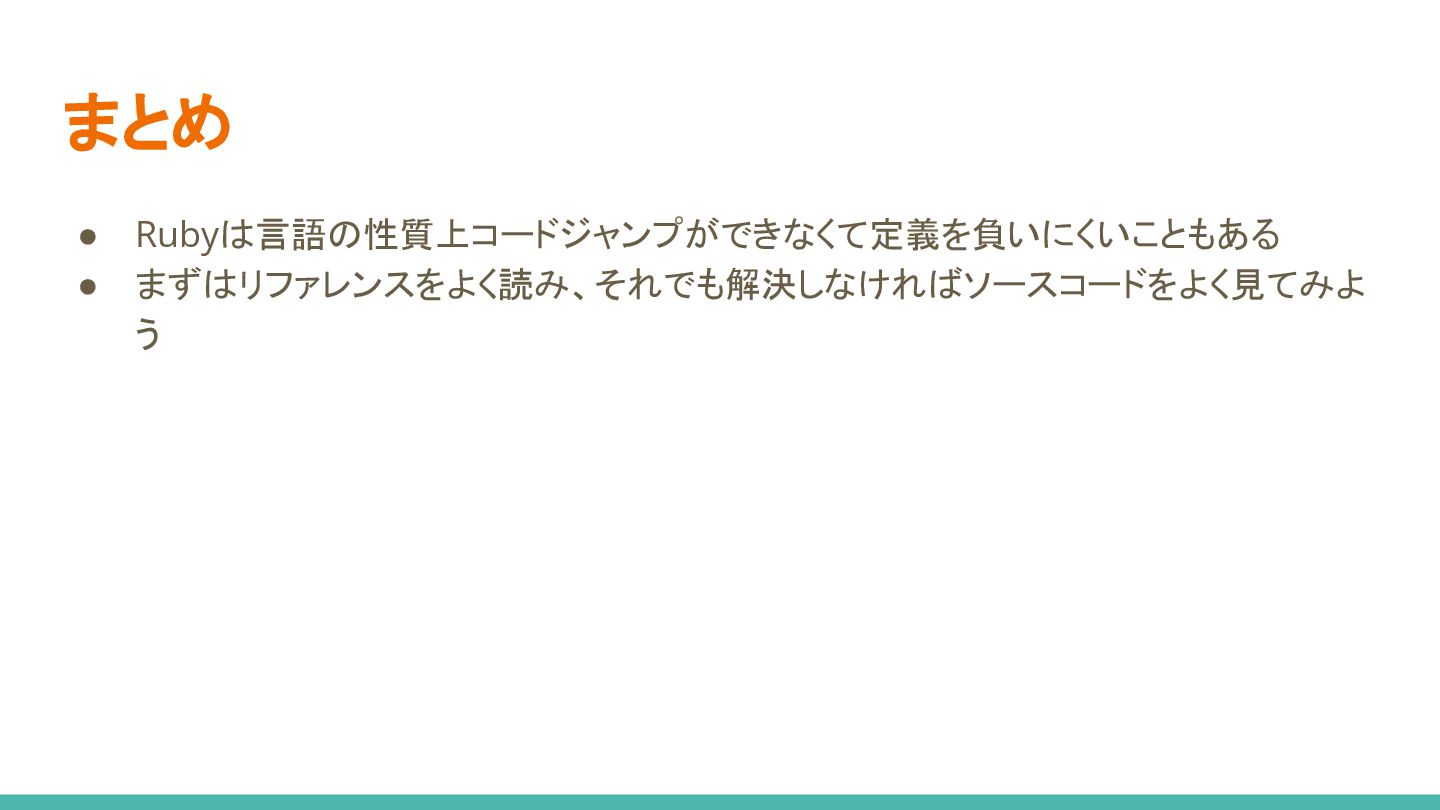 まとめ • Rubyは言語の性質上コードジャンプができなくて定義を負いにくいこともある • まずはリファレンスをよく読み、それでも解決しなければソースコードをよく見てみよ う