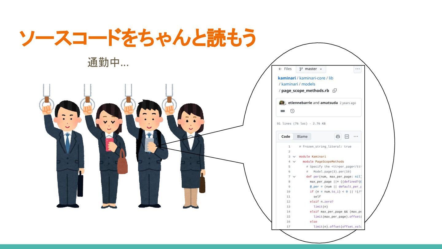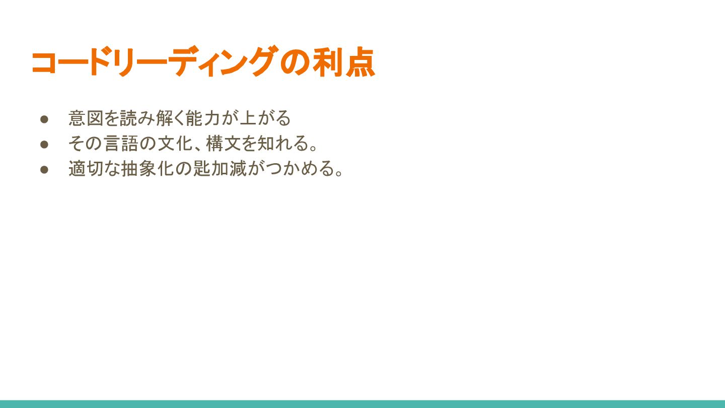 コードリーディングの利点 • 意図を読み解く能力が上がる • その言語の文化、構文を知れる。 • 適切な抽象化の匙加減がつかめる。