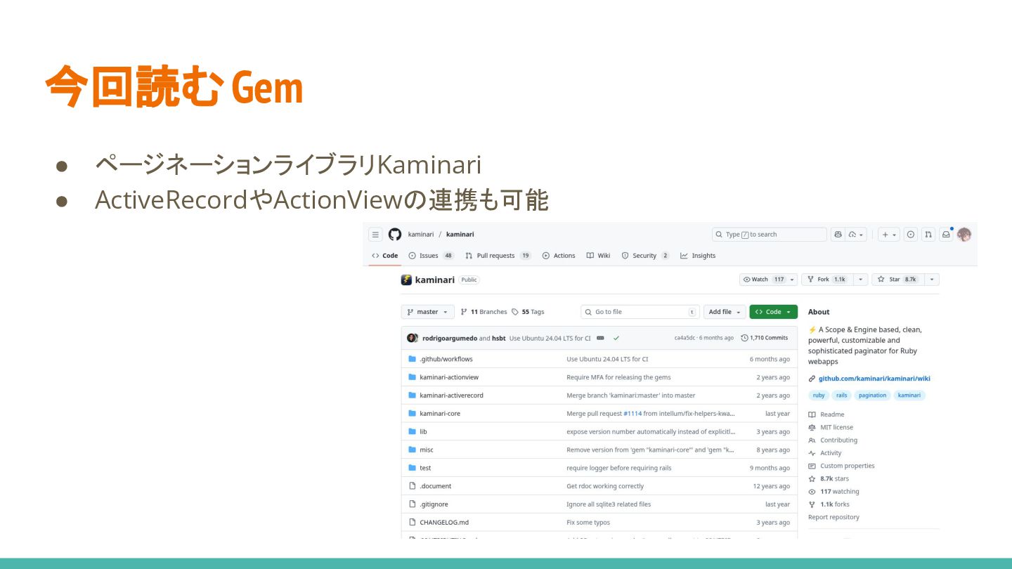 今回読むGem • ページネーションライブラリKaminari • ActiveRecordやActionViewの連携も可能