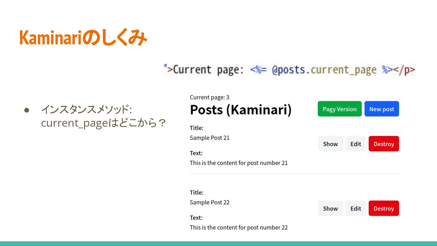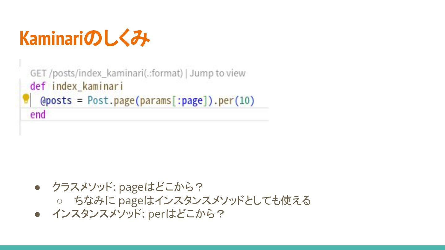 Kaminariのしくみ • クラスメソッド: pageはどこから? ◦ ちなみに pageはインスタンスメソッドとしても使える • インスタンスメソッド: perはどこから?