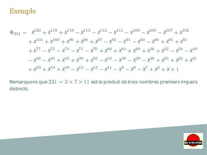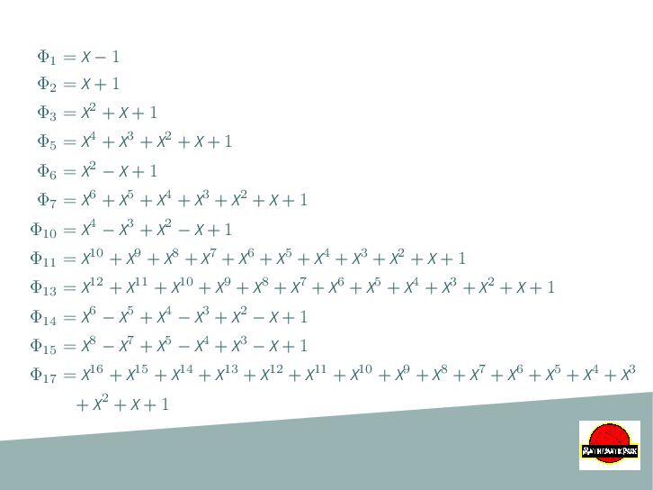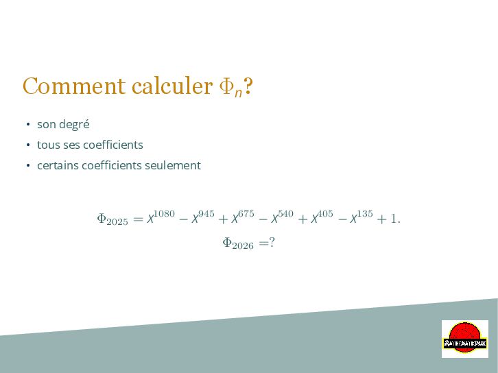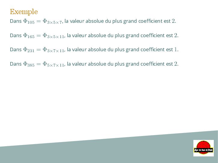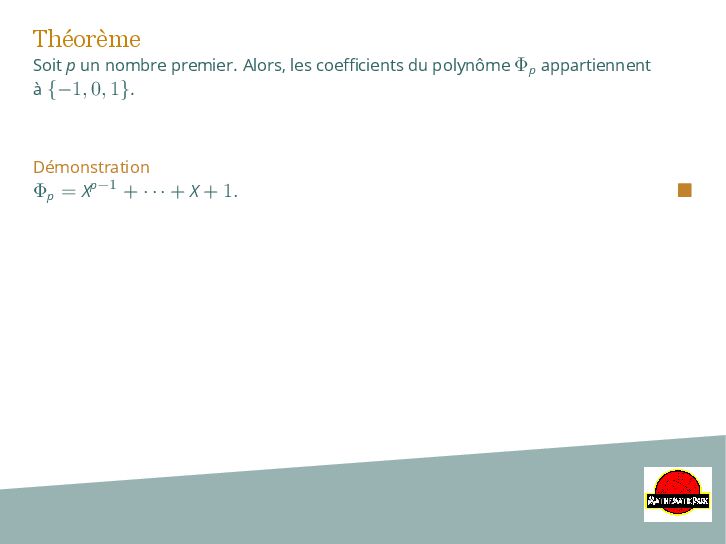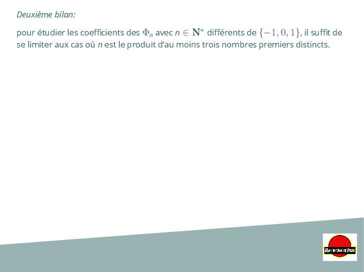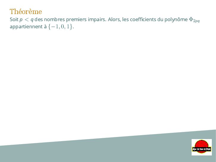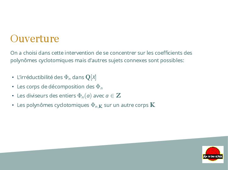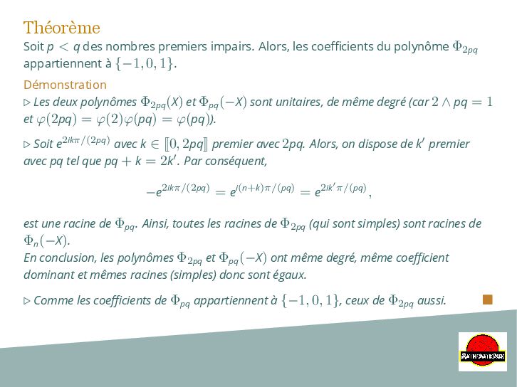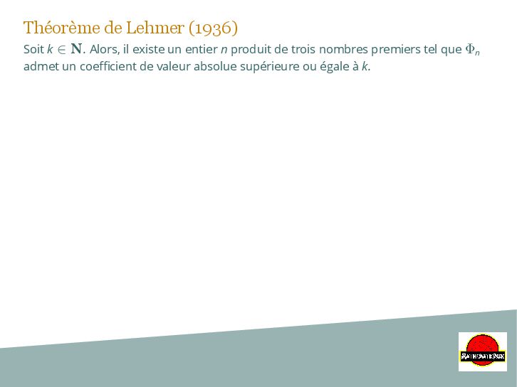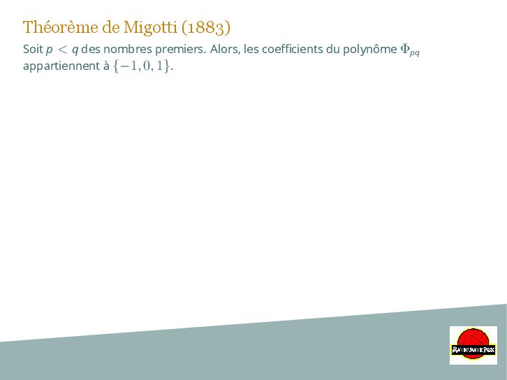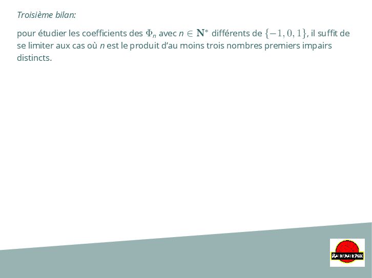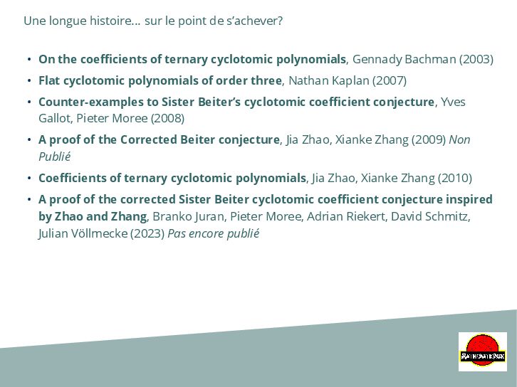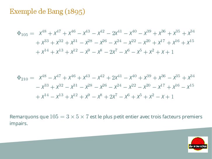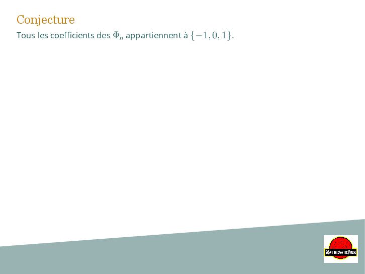 Résumé : Apparus dans les travaux de Gauss sur la constructibilité à la règle et au compas, les polynômes cyclotomiques sont des objets faciles à définir mais qui recèlent encore quelques mystères mathématiques. Avec cette balade historico-mathématique, on se propose d'examiner les coefficients de ces polynômes à travers un siècle de théorèmes (Migotti, Bang, Schur, Beiter et Suzuki)