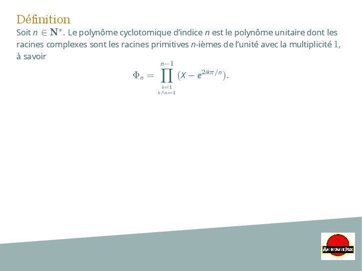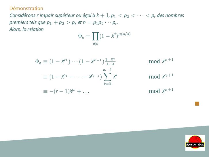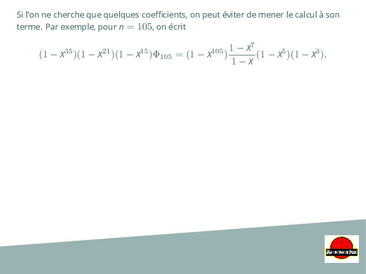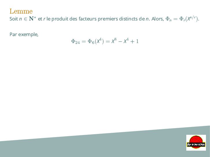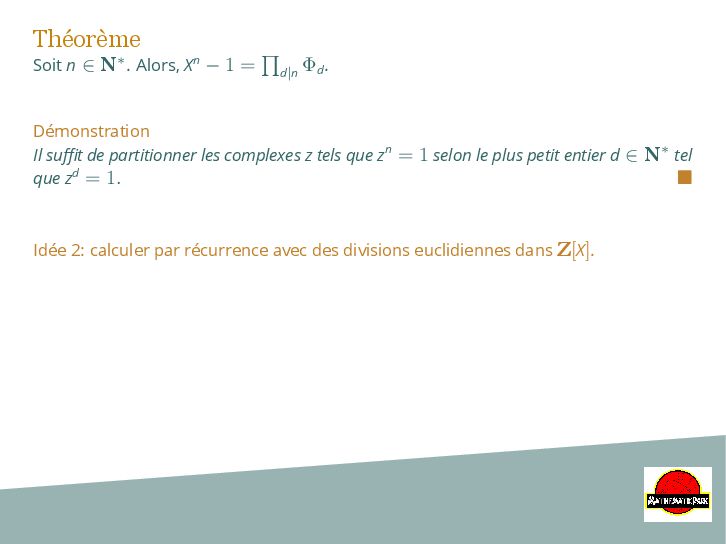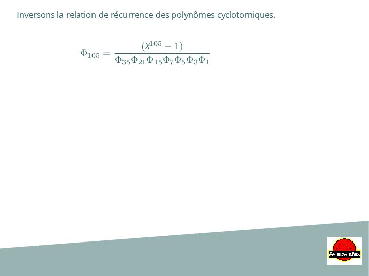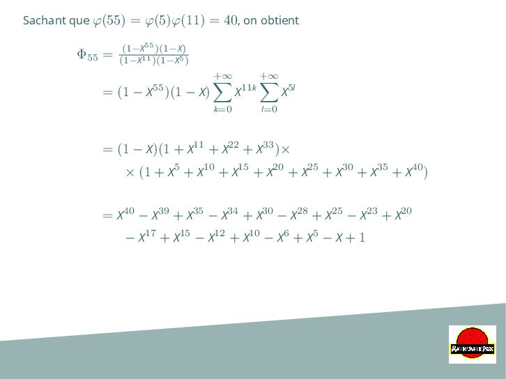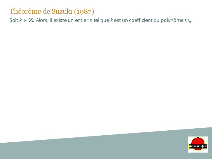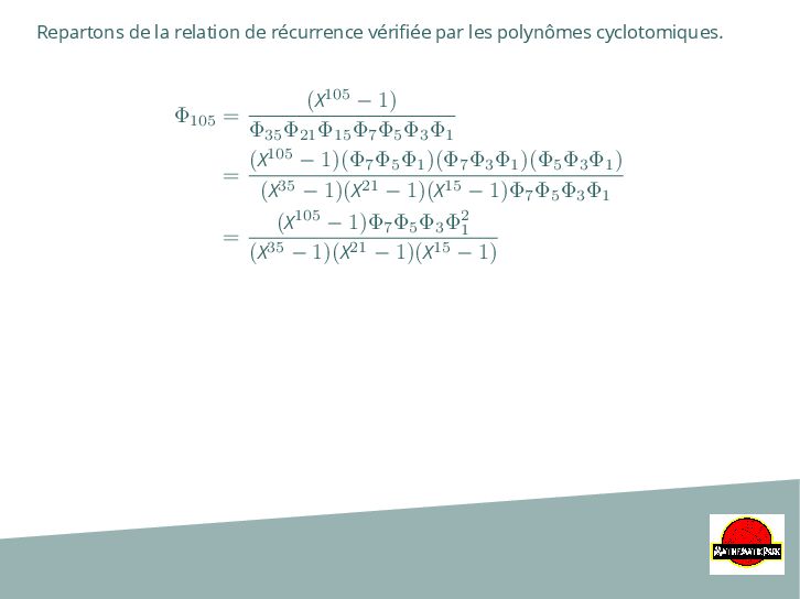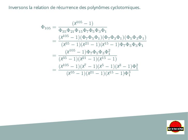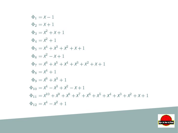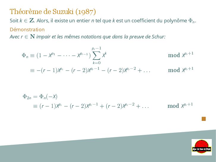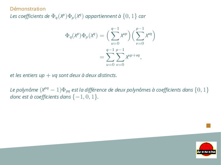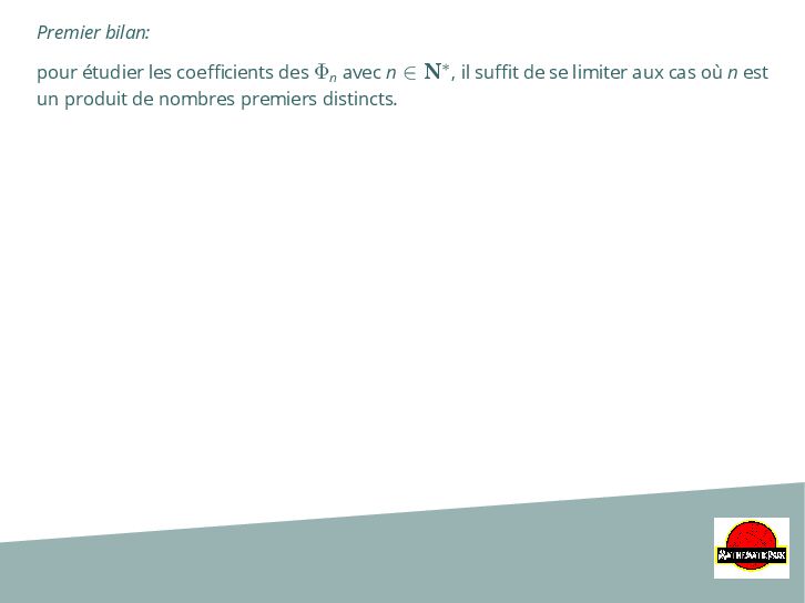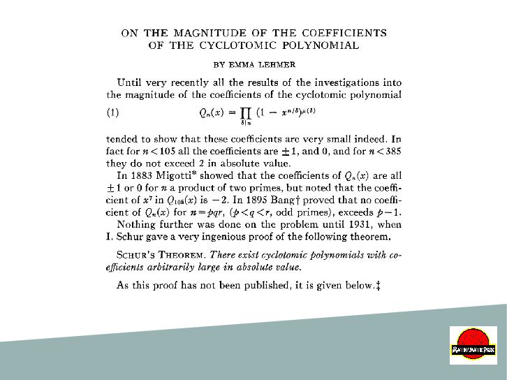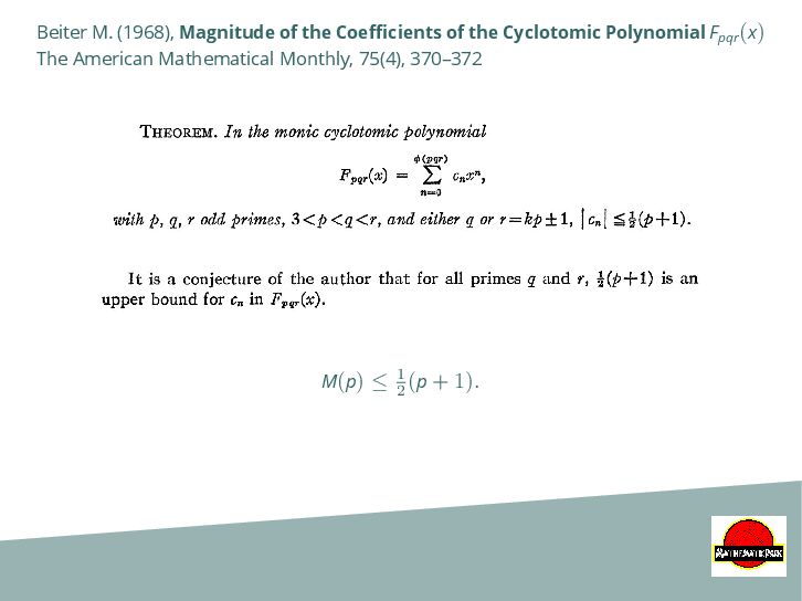 Résumé : Apparus dans les travaux de Gauss sur la constructibilité à la règle et au compas, les polynômes cyclotomiques sont des objets faciles à définir mais qui recèlent encore quelques mystères mathématiques. Avec cette balade historico-mathématique, on se propose d'examiner les coefficients de ces polynômes à travers un siècle de théorèmes (Migotti, Bang, Schur, Beiter et Suzuki)