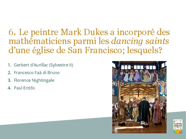 les dancing saints d’une église de San Francisco; lesquels? 1. Gerbert d’Aurillac (Sylvestre II) 2. Francesco Faà di Bruno 3. Florence Nightingale 4. Paul Erdős