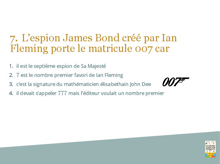matricule 007 car 1. il est le septième espion de Sa Majesté 2. 7 est le nombre premier favori de Ian Fleming 3. c’est la signature du mathématicien élisabethain John Dee 4. il devait s’appeler 777 mais l’éditeur voulait un nombre premier