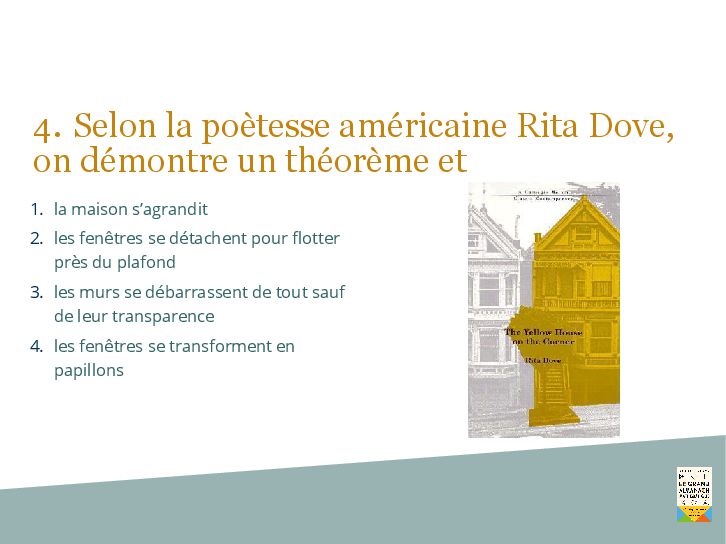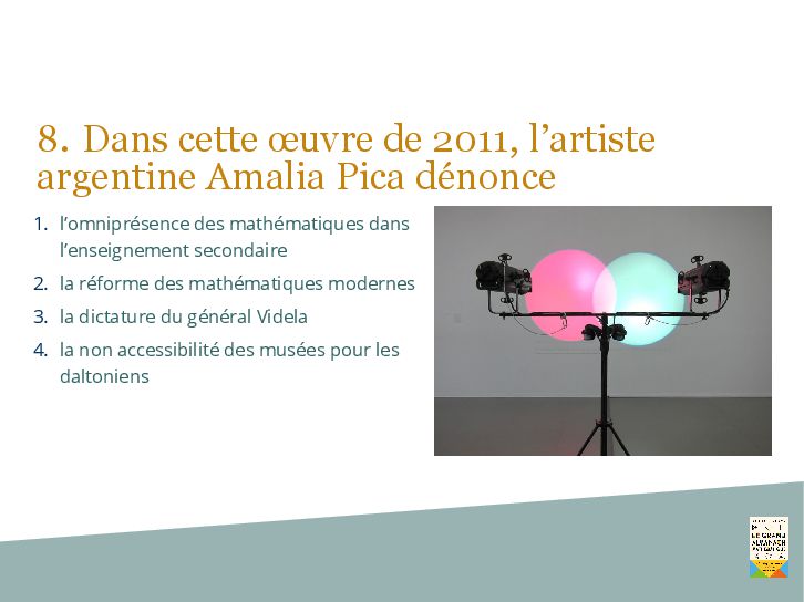 dénonce 1. l’omniprésence des mathématiques dans l’enseignement secondaire 2. la réforme des mathématiques modernes 3. la dictature du général Videla 4. la non accessibilité des musées pour les daltoniens