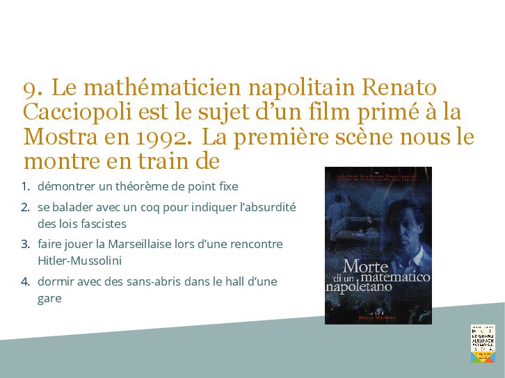 film primé à la Mostra en 1992. La première scène nous le montre en train de 1. démontrer un théorème de point fixe 2. se balader avec un coq pour indiquer l’absurdité des lois fascistes 3. faire jouer la Marseillaise lors d’une rencontre Hitler-Mussolini 4. dormir avec des sans-abris dans le hall d’une gare