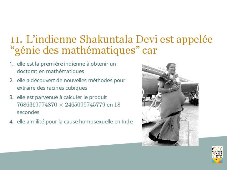 1. elle est la première indienne à obtenir un doctorat en mathématiques 2. elle a découvert de nouvelles méthodes pour extraire des racines cubiques 3. elle est parvenue à calculer le produit 7686369774870 × 2465099745779 en 18 secondes 4. elle a milité pour la cause homosexuelle en Inde