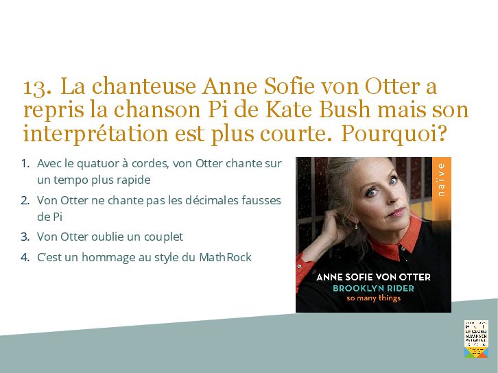chanson Pi de Kate Bush mais son interprétation est plus courte. Pourquoi? 1. Avec le quatuor à cordes, von Otter chante sur un tempo plus rapide 2. Von Otter ne chante pas les décimales fausses de Pi 3. Von Otter oublie un couplet 4. C’est un hommage au style du MathRock