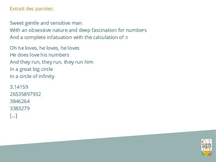 obsessive nature and deep fascination for numbers And a complete infatuation with the calculation of π Oh he loves, he loves, he loves He does love his numbers And they run, they run, they run him In a great big circle In a circle of infinity 3.14159 26535897932 3846264 3383279 [...]