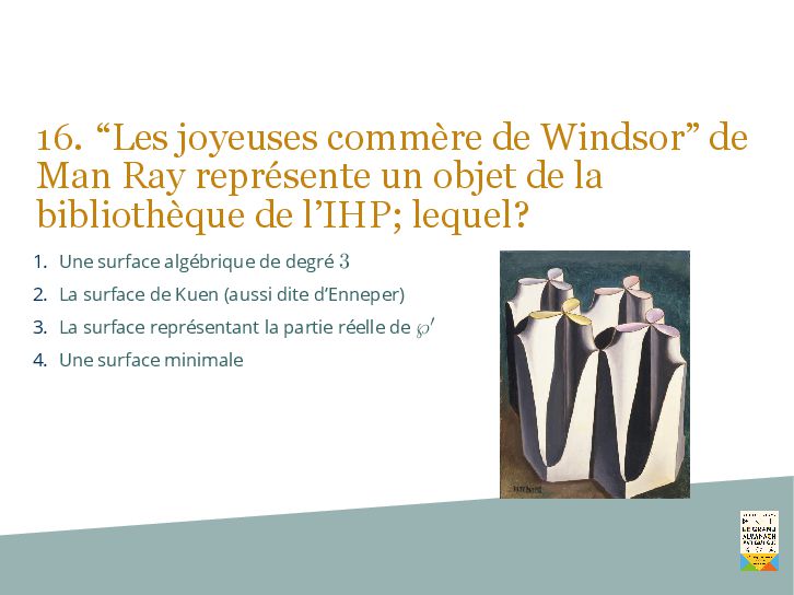 un objet de la bibliothèque de l’IHP; lequel? 1. Une surface algébrique de degré 3 2. La surface de Kuen (aussi dite d’Enneper) 3. La surface représentant la partie réelle de ℘′ 4. Une surface minimale