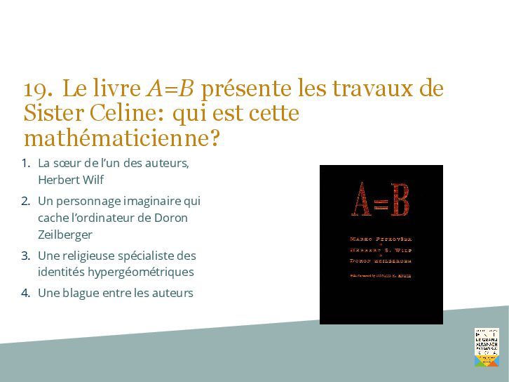 qui est cette mathématicienne? 1. La sœur de l’un des auteurs, Herbert Wilf 2. Un personnage imaginaire qui cache l’ordinateur de Doron Zeilberger 3. Une religieuse spécialiste des identités hypergéométriques 4. Une blague entre les auteurs