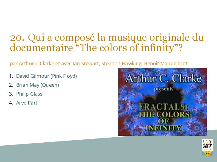 colors of infinity”? par Arthur C Clarke et avec Ian Stewart, Stephen Hawking, Benoît Mandelbrot 1. David Gilmour (Pink Floyd) 2. Brian May (Queen) 3. Philip Glass 4. Arvo Pärt